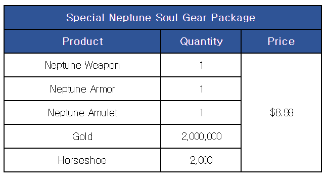 [Special Neptune Soul Gear Package] ■ Sale Period: Mar 14th Update - Apr 11th Update 2024 (UTC). ■ Products and Price ※ This package can be purchased up to once per account.