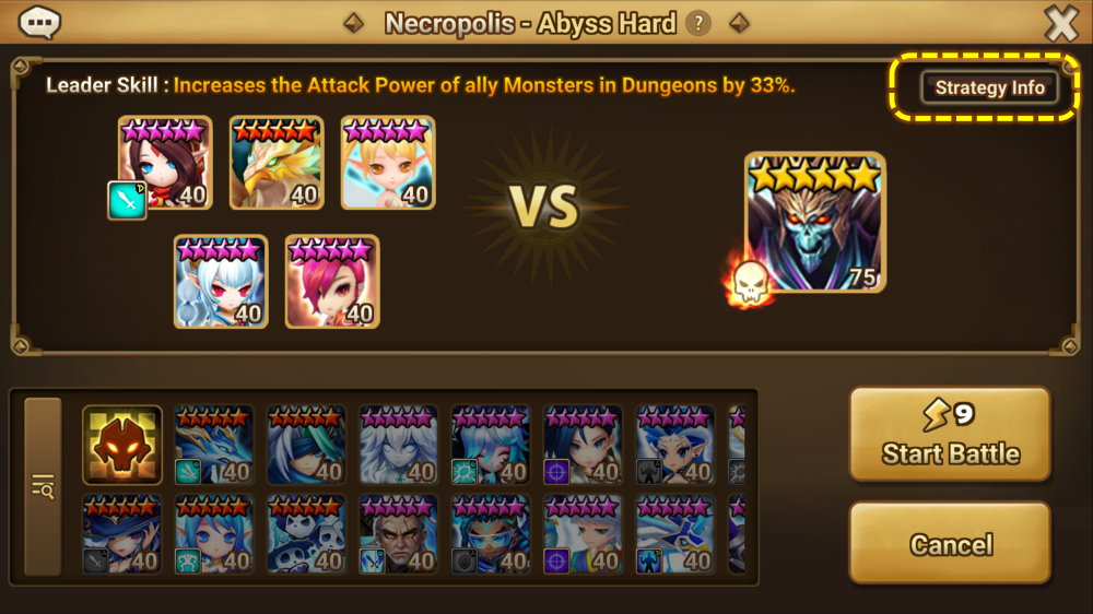 - A [Strategy Info] button has been added to the battle preparation screen for some content. (Content: Cairos Dungeon / Rift Dungeon / Dimension Hole / Labyrinth of Tartarus / Monster Subjugation)