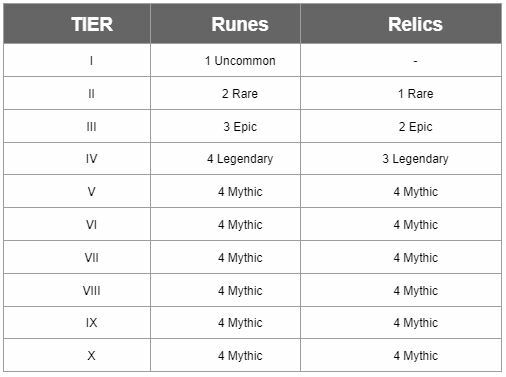 You will receive 4 Tier IV Relics per Mythic in your Inventory.