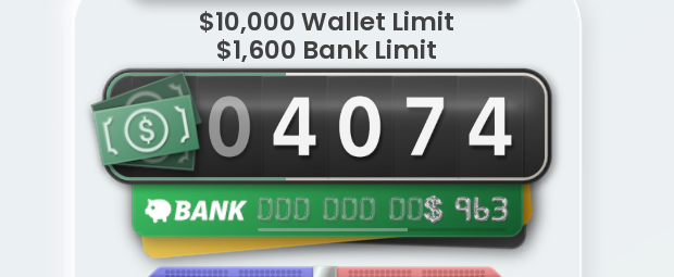 - Your wallet and bank maximums can now easily be viewed on the inventory screen and will reflect any upgraded maximum capacity from ATM upgrades or Dr Powicks research lab.