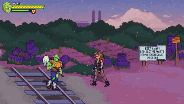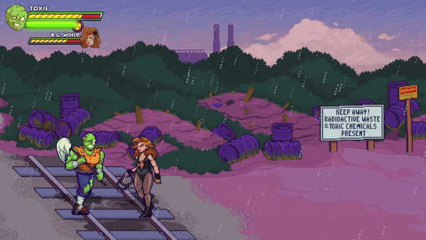 Armed with a dangerously lethal whip, this Tromaville thug poses a significant threat to the Toxic Crusaders! Capable of inflicting pain with her weapon, B.G. Whip will take swipes at any enemy standing in front of her! Unlike other thugs, her attack animation will play constantly, until the enemy she’s targeting gets FLUNG to the other side of the screen!