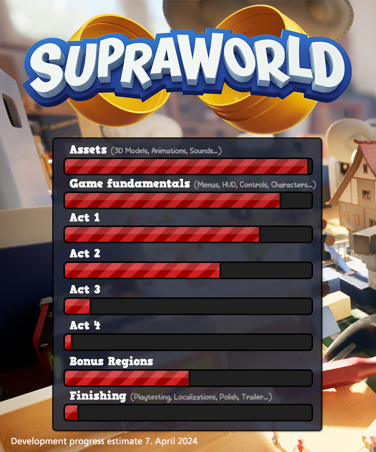 When Supraworld is done? I dunno! But I made this graphic with a vague estimate so you get an idea where we're at. When the Fundamentals and Act 1 are done we can basically start playtesting up to that point, which would happen in the form of Early Access here on Steam.