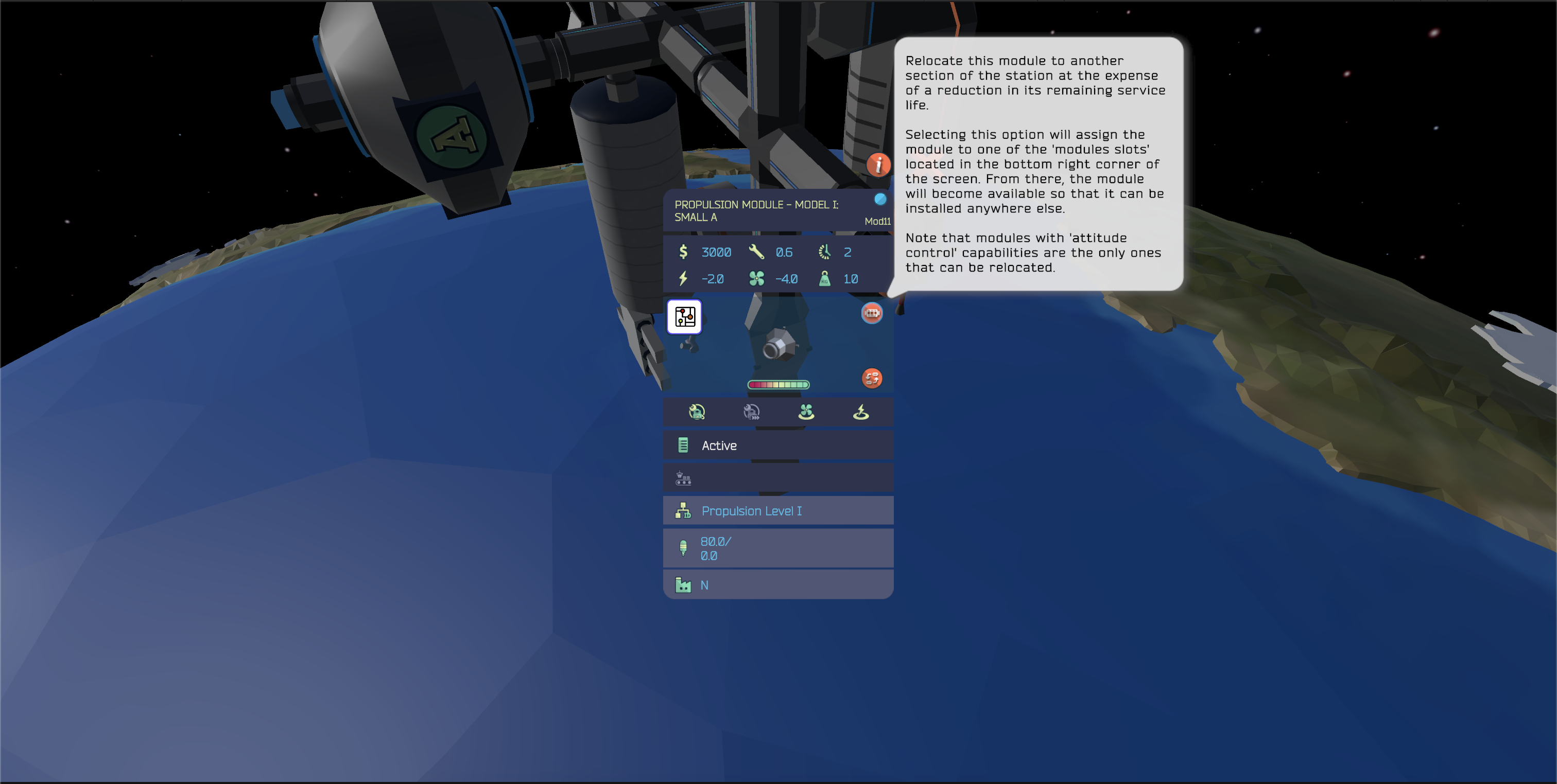 As the station evolves and grows, what used to be an optimal location for a propulsion module or a thruster pod may not longer be the case. To resolve this, we've added a new 'Module Relocation' mechanic, that only works for modules with propulsion capabilities: