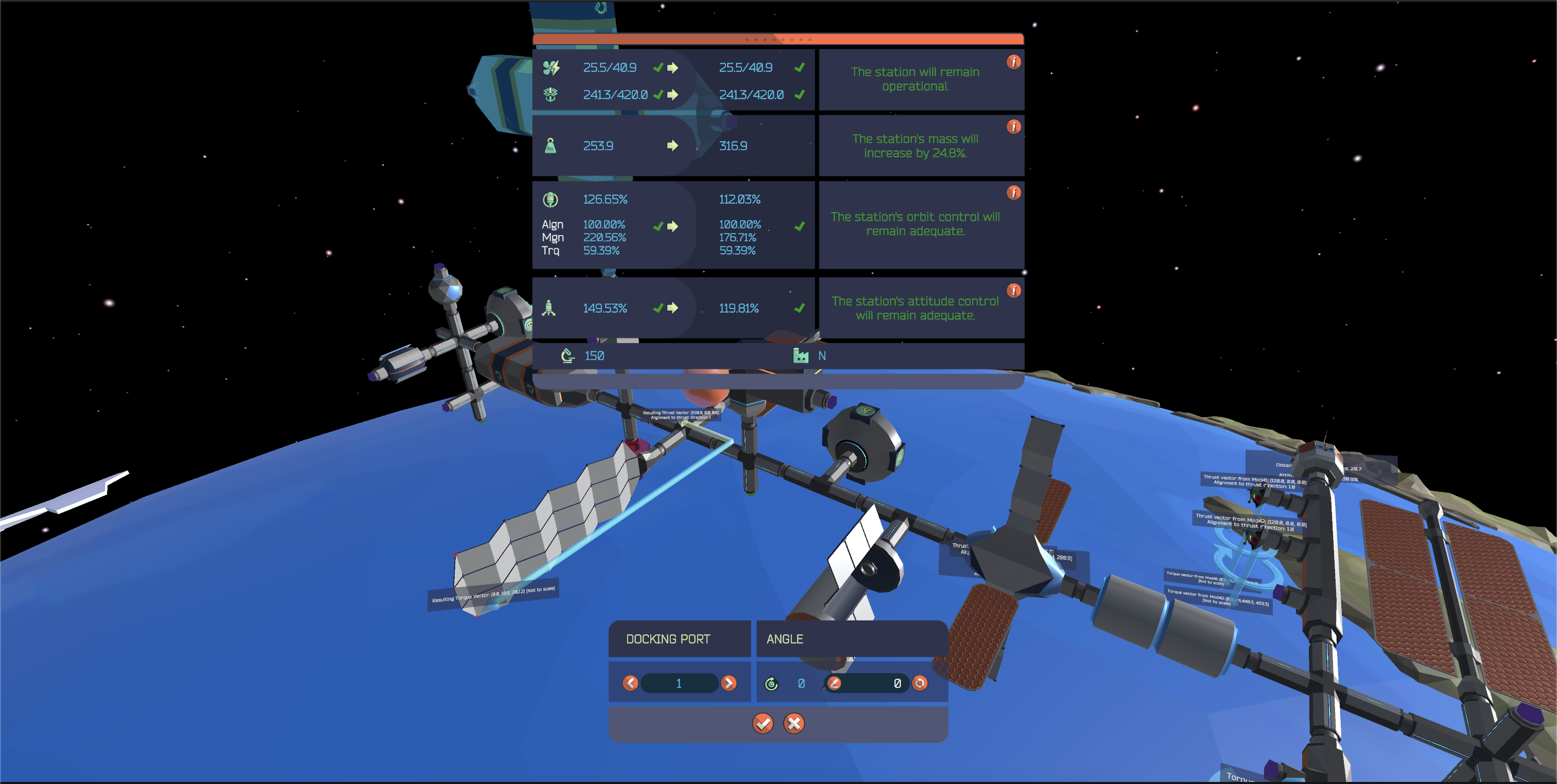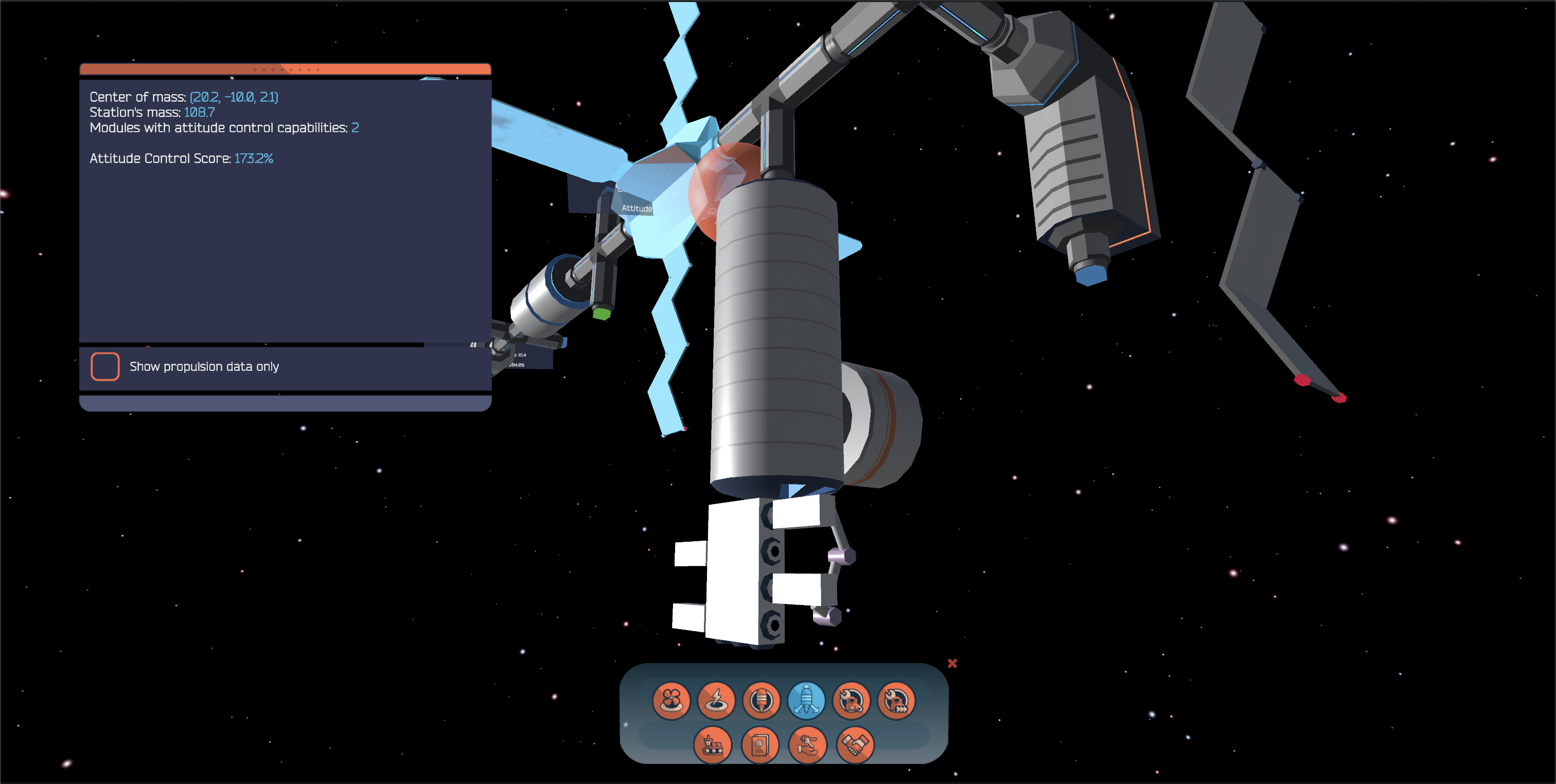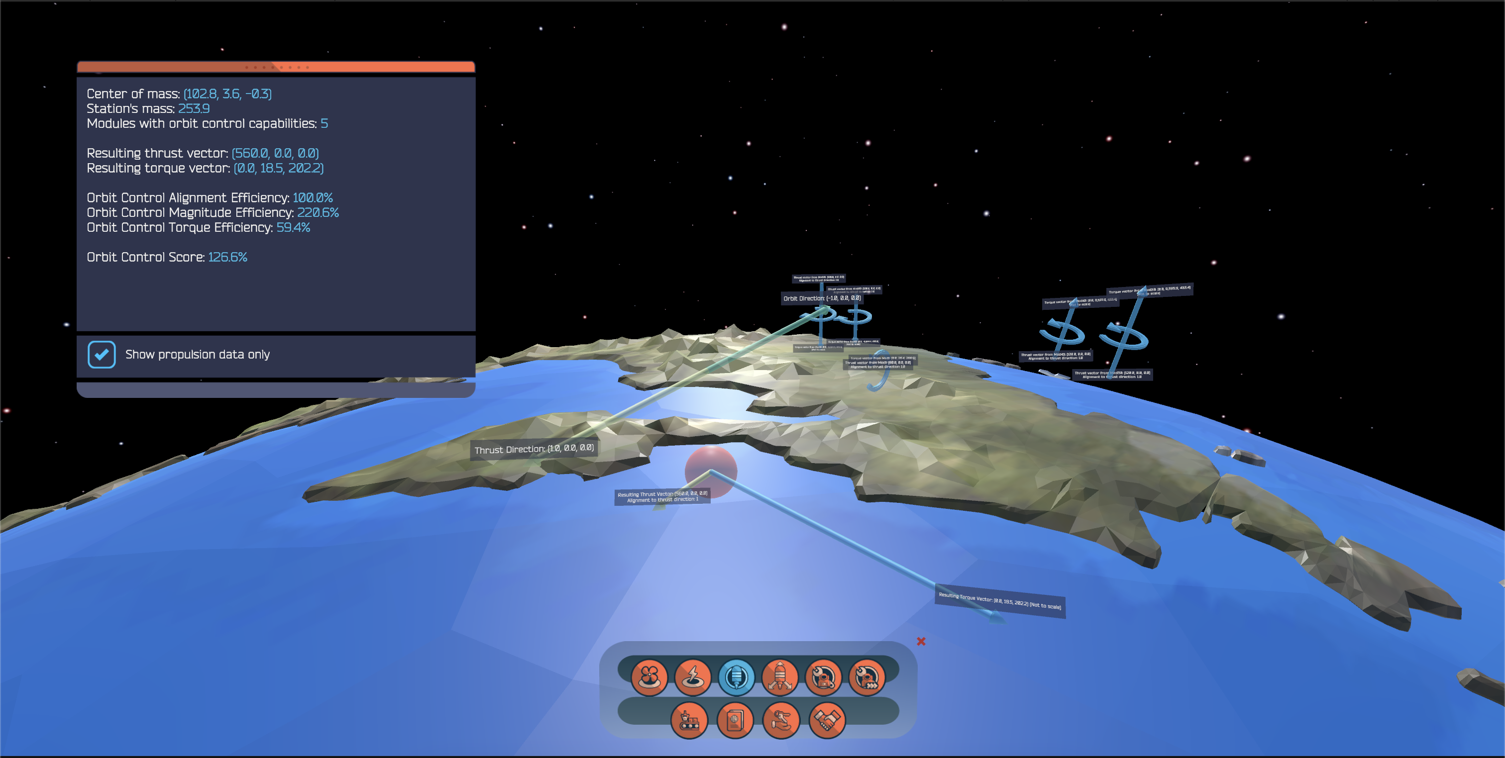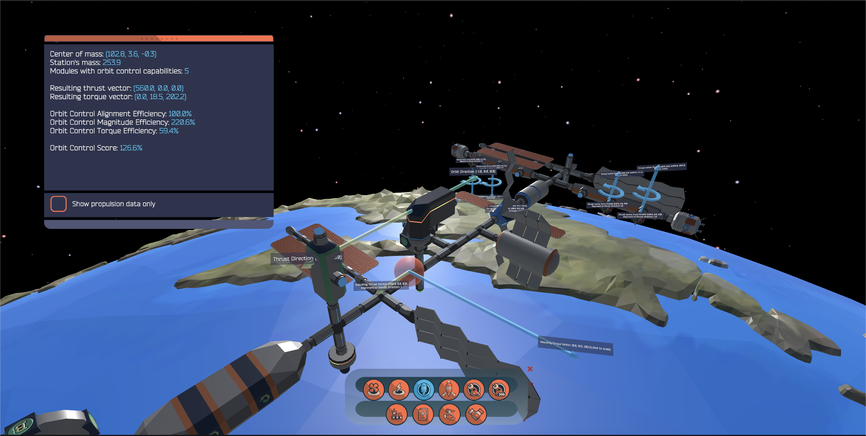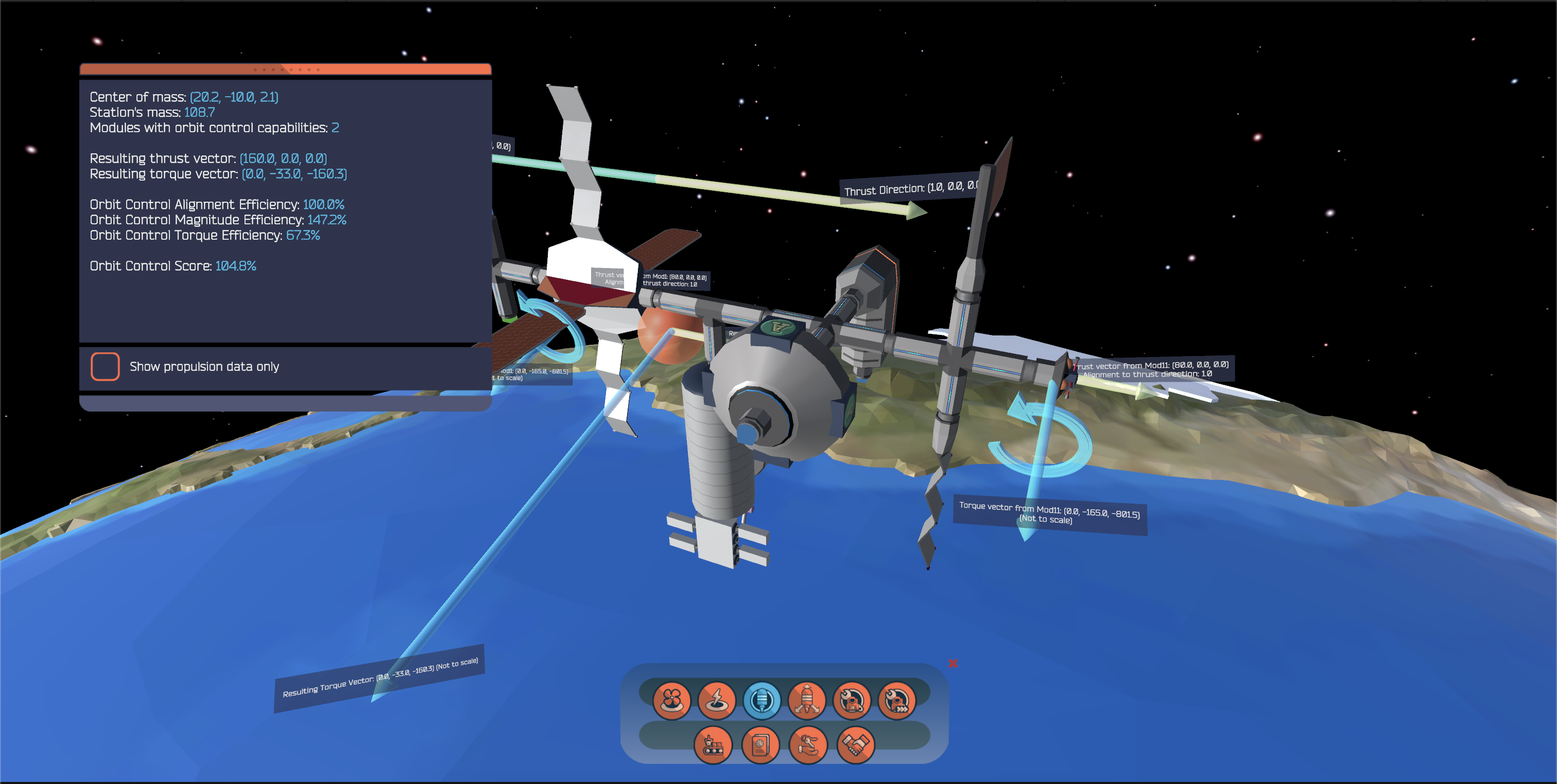 Up until this version, Space Station Designer featured a relatively simplistic propulsion model, where the only requirement was to install enough propulsion to support the station's mass. As part of version 0.5.25, we're introducing a completely new model that is both more challenging and realistic. This model features two new concepts: 'orbit control' and 'attitude control'.