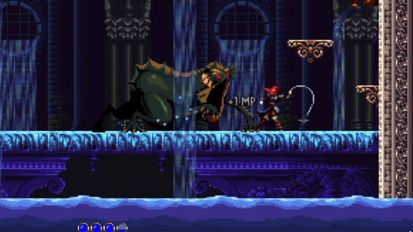It is, as it appears, an unabashed homage to Castlevania, but with none of the -vania, making it much more like the original (or the game boy ones, and possibly a few others in the series I don't know about): a straightforward, linear platform game about whipping monsters and not stepping on spikes. Ten a penny, right? But CNSBL captures it so well that it had me looking up old game boy tunes it vaguely reminded me of.