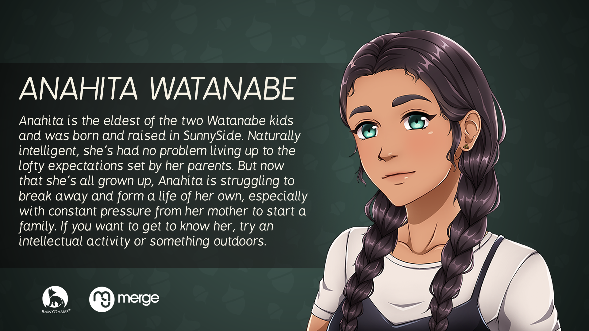 Anahita is the eldest of the two Watanabe kids and was born and raised in SunnySide. Naturally intelligent, she's had no problem living up to the lofty expectations set by her parents. But now that she's all grown up, Anahita is struggling to break away and form a life of her own, especially with constant pressure from her mother to start a family. If you want to get to know her, try an intellectual activity or something outdoors.
