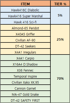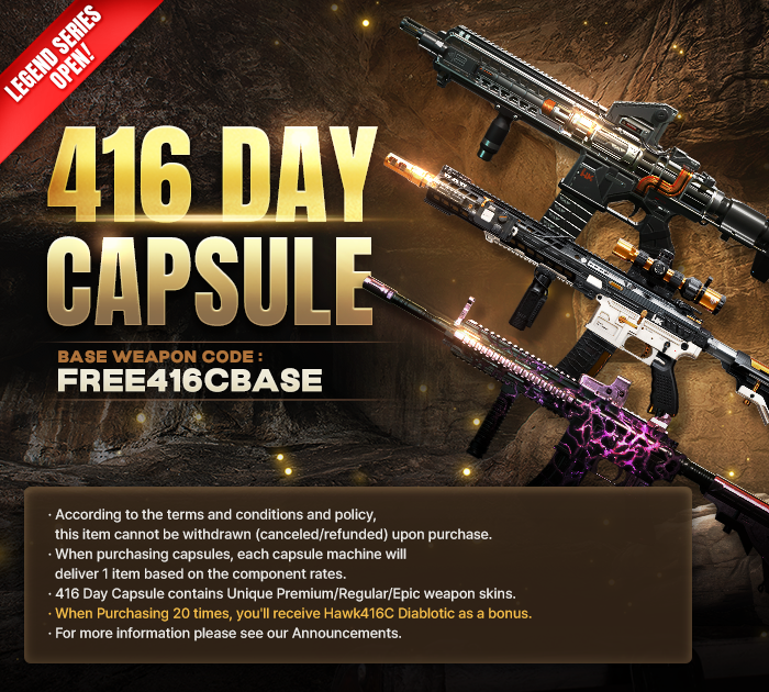 Please note that: Legend 416 Series Capsule contains Premium, Epic, and Regular tier weapon skins.[/b] When you purchase 20 capsules, you will obtain Hawk416C Diabolic as a bonus!