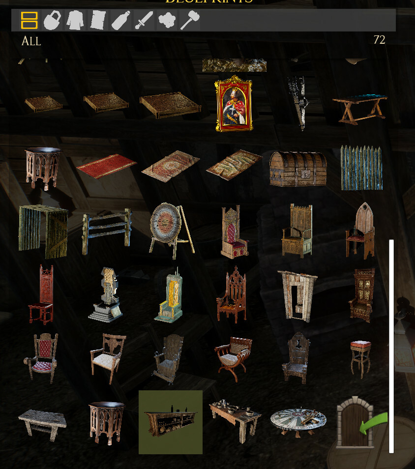 New Furnishings: Enhance the grandeur of thy castle with a plethora of new chairs, thrones, and tables added to the workbench. Deck thy halls with fine furnishings fit for a noble ruler, and make thy mark upon the kingdom.