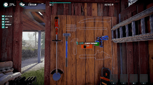 The player has more and more tools, and slowly begins to run out of space for them in the carrying inventory, so we have added a wall of tools to the game. On the wall we will be able to leave equipment that we don't happen to use for a particular job, and we will be able to carry only the necessary tools with us.