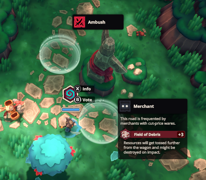 When you enter a crossroads, you can still choose between two events (e.g. ambush, safe camp). Every path may include a challenge (e.g. stronger rabbit) which adds some difficulty. So why should you choose a path with a challenge? For every challenge you take, you will earn points, which can be exchanged for rewards in the safe camp. Once you have traded them in at the safe camp, the challenges will end. For example, no more annoying rain disturbing your fire! 🙅♀️🌧️