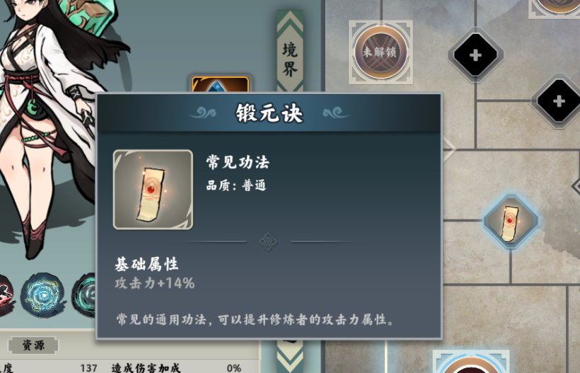 After characters reach the Crystal Realm, they can initiate martial arts training in the Dao Path. Players can obtain martial arts books through stage drops, quest rewards, or marketplace purchases. Different types of martial arts books correspond to different attributes, with higher-quality martial arts providing higher values and additional attributes. Placing martial arts books in the martial arts nodes of character paths will grant corresponding attribute bonuses (note: this will consume martial arts books). Additionally, some martial arts have associated counterparts. If characters simultaneously practice these martial arts, they can unlock stronger attribute bonuses! Finally, in future updates, perhaps we can merge two sets of martial arts to create unique and unparalleled martial arts!