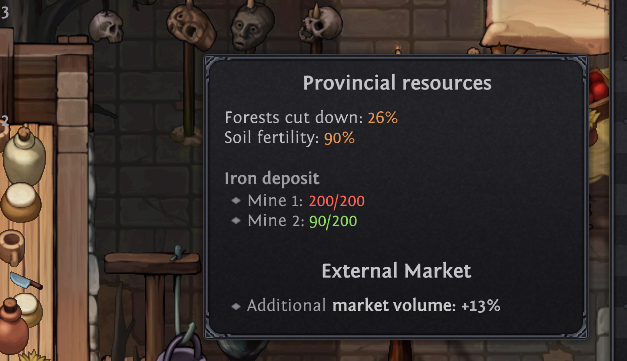 Now, the iron in mines is finite. You can extract 100 units for each level of the mine (and the cost increases with each level). Caravans also bring less iron and steel. Thus, the only infinite source will be the predefined five provinces on the world map selling iron. Controlling them will be very important from the middle of the game (in conjunction with the trade reduction conditions I wrote about earlier. It may come to the point where you have to fight bandit camps in neighboring territories so that iron supplies do not decrease).