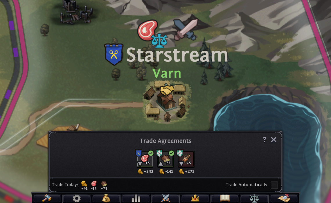 Trading is now possible only through contract negotiations. Neighbors will offer simple resources for sale, such as rye, wood, and iron, and buy more complex ones like tools, weapons, and medicine. As cities develop, demand will change — if small settlements want to buy tools, developed cities will be interested in heavy armor or swords.
