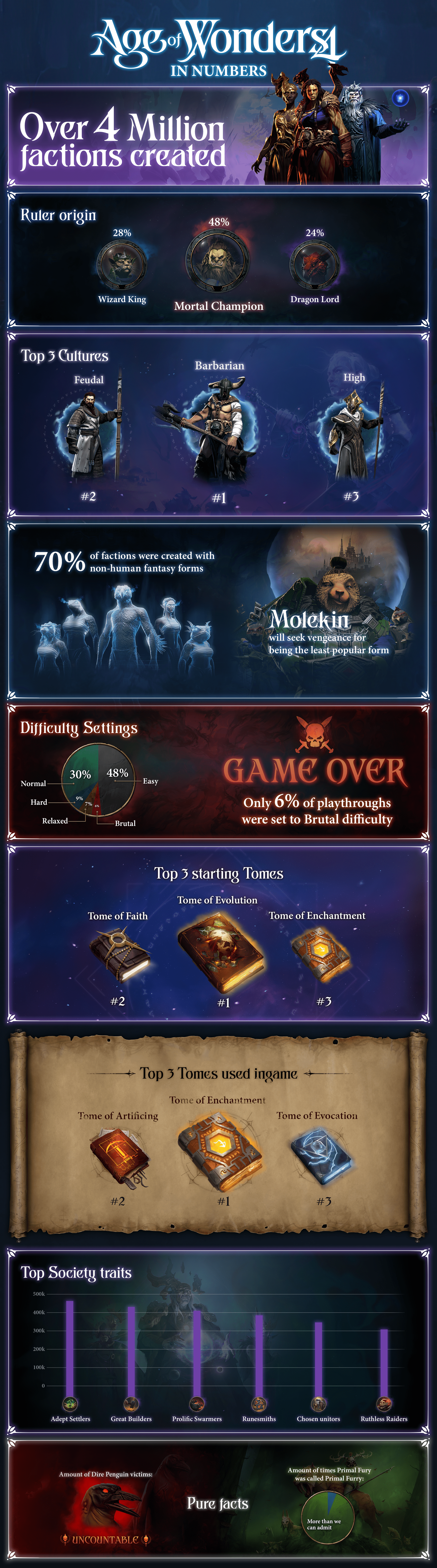 Which culture is the most popular? How many rulers were created? Which is the least popular faction? Should we be worried about the dire penguins? Check it out now as we collected some facts for you!