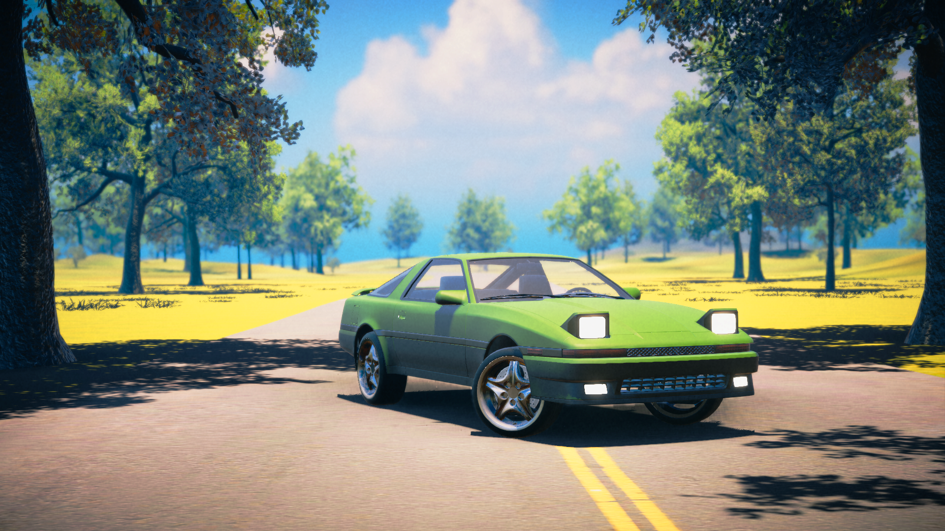 Crafted farming elements, such as garden beds and plants.