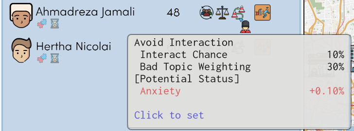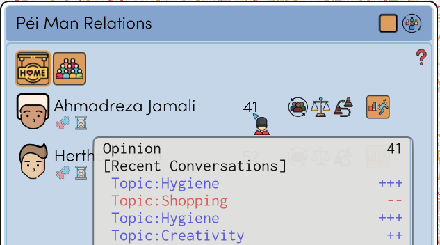When two people are at the same location they have a chance to interact. They'll decide on a semi-random topic and depending on their preferences will improve or reduce their opinion of each other. Some examples would be: