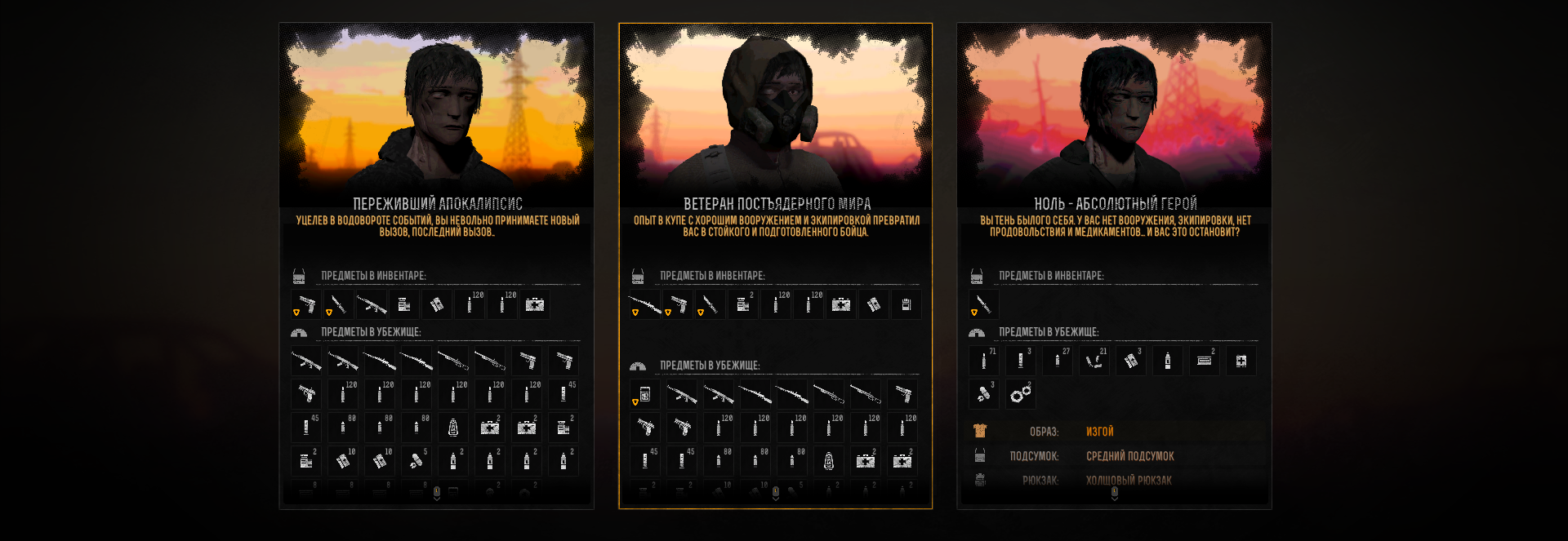 Начиная новую игру, каждому игроку необходимо выбрать один из трёх стартовых наборов. Каждый набор даёт свои стартовые предметы и экипировку. В будущем каждый сетап будет применять специальные модификаторы усложняя или облегчая игровой процесс.