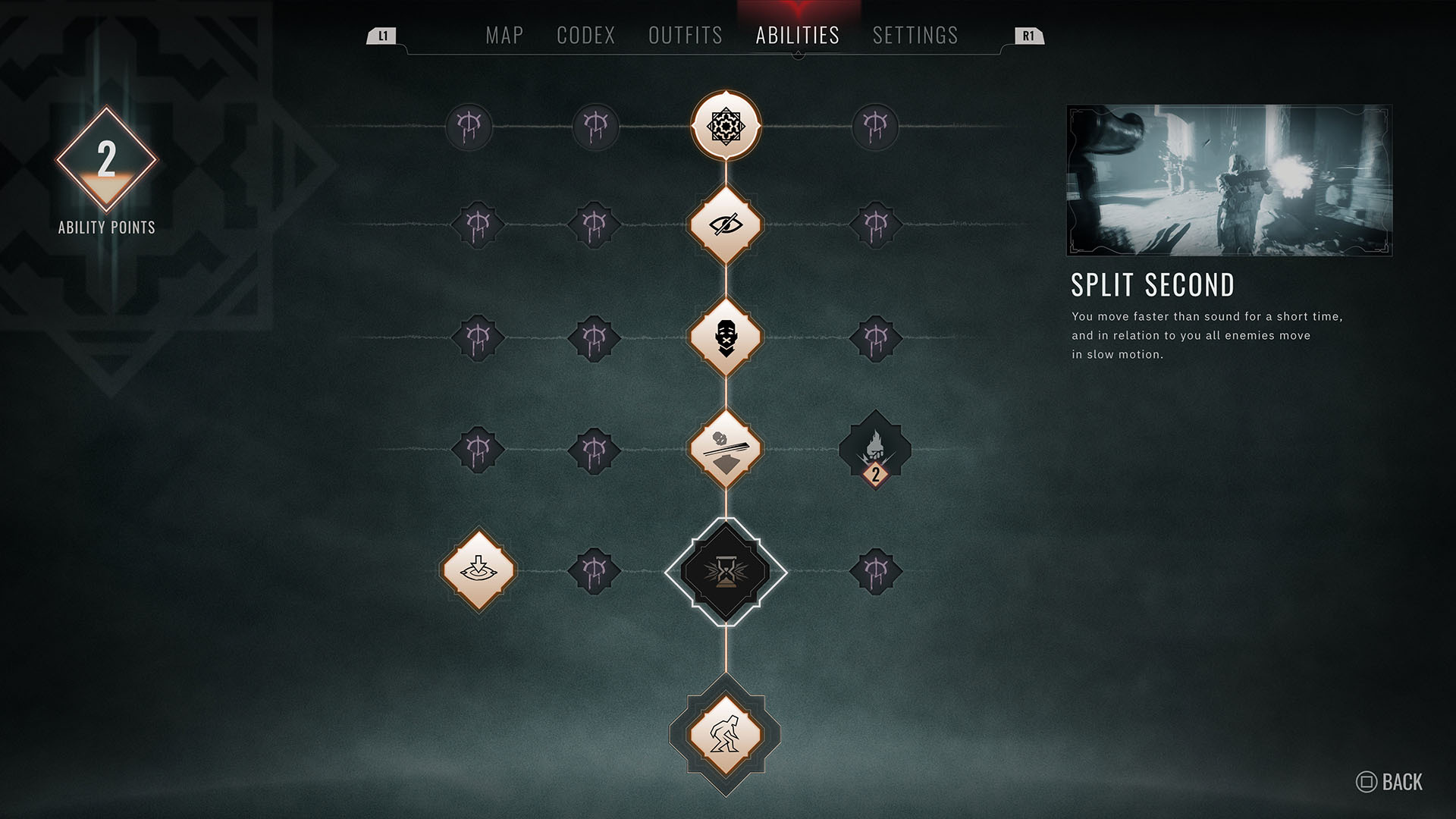 Ability tree for Banu Haqim with all clan abilities and the clan perk are unlocked. An ability from the Tremere tree has been equipped instead of Split Second.