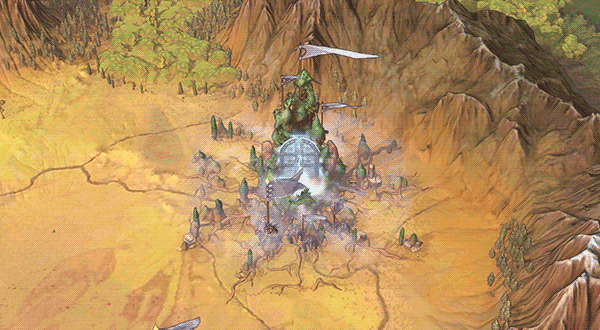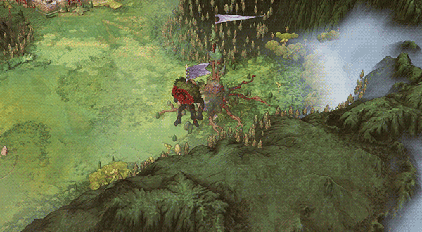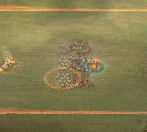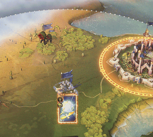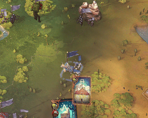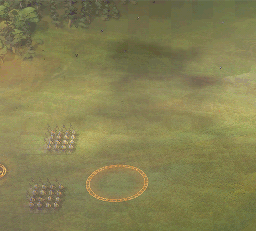 So, we added some play effects consisting of some grey and golden construction smoke (so it’s visible on the light and dark side). After it’s gone, a small camp surrounds the army, consisting of tents, a small watchtower and a barricade, making sure no one enters. A small golden glow ensures that the camp has good contrast on all types of grounds. Only after you move will the camp get destroyed and disappear.