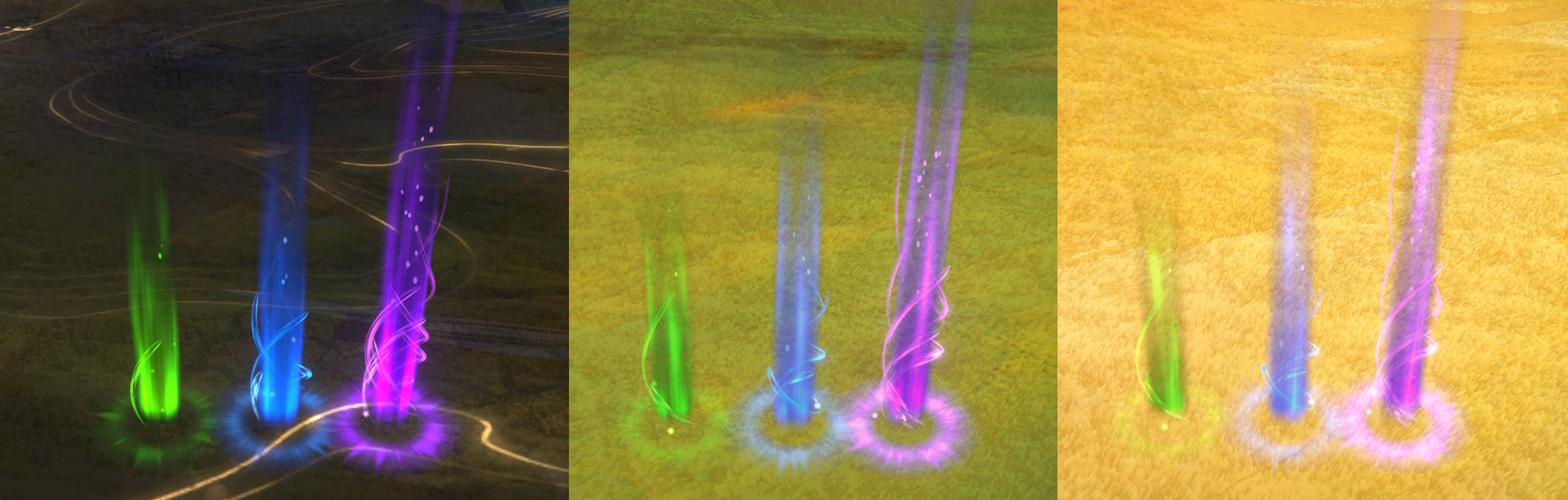 On the darker side, the colorful sparkles and swirls are well visible and give shape to the light beam. To make these also visible on our green and yellow biomes, we added a black glow behind the beams. They’re not visible in the dark biome, not only give depth to the beams in the lighter biomes, but also add contrast to make them visible.