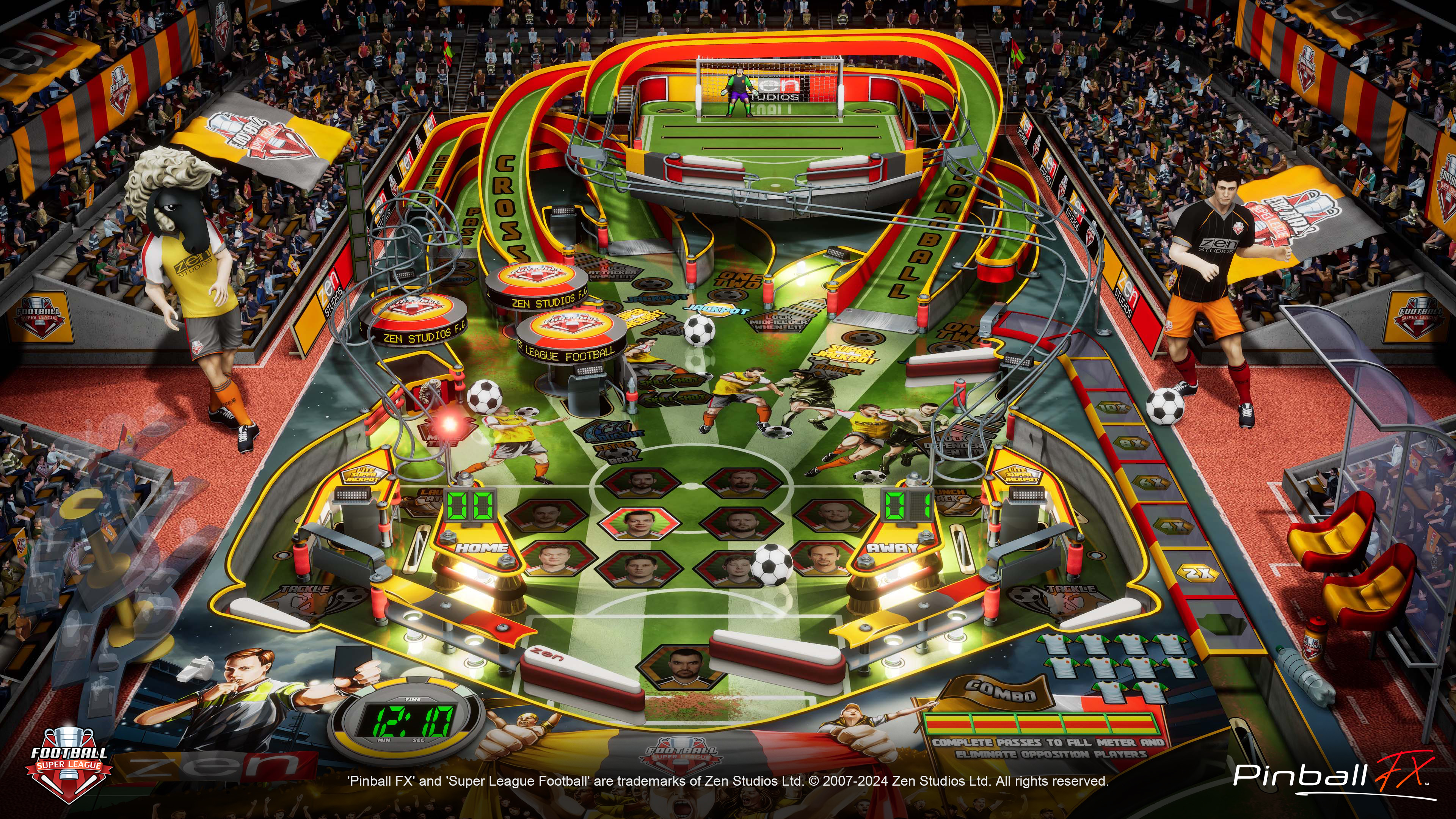 - Zen Studios F.C. is ready for victory! Guide your team of players sporting developer likenesses - Launch your attack and score on the mini-playfield - Master player skills in several different multiball modes each tied to must-have talents in football - Fill your trophy cabinet with your progress saved between games - Reach the Golden Goal Wizard Mode and shoot for stellar scores