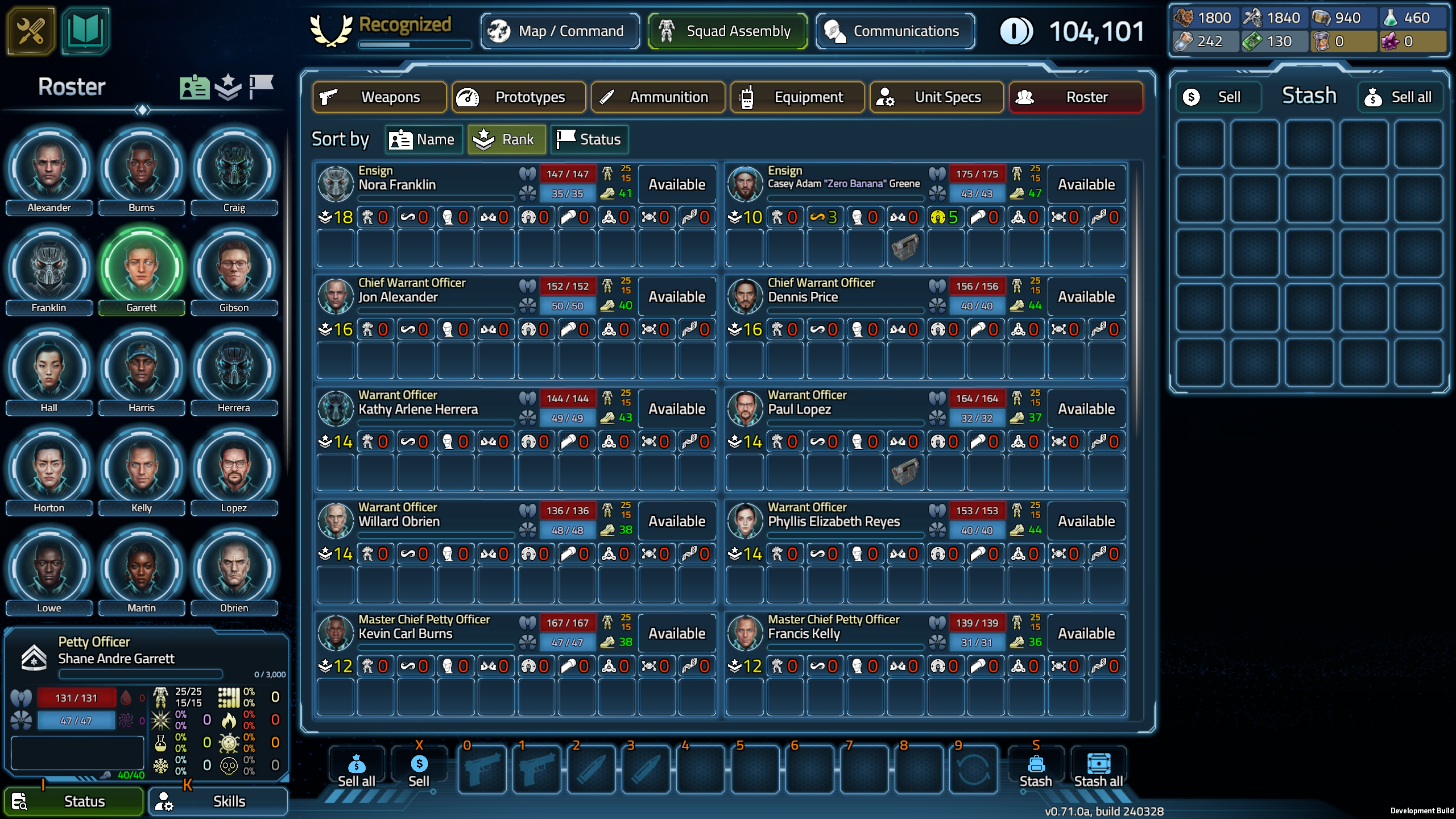 One of the most important differences is that you have a fixed starting roster of 30 marines, including your avatar, the returning crew of U.S.C. Wraith (15 marines), and 14 (randomized) marines from your fleet. All of them have preset skills and ranks, with some spare skill points left, so you can start training them in the direction you want to from the get-go. Unlike non-Campaign games, units will gain Experience Points (XP) for all kinds of actions they perform and, with that, achieve promotions that give them new skill points and other perks. “Demoting” or re-organizing their skills will not be an option, nor will resurrecting the dead (yes, we are talking about permadeath!). Sometimes you’ll have to wait until you can re-deploy a marine (if they are seriously injured or assigned to a somewhat longer task or mission, etc.), so you’ll have to make sure you don’t only have an “A-Team” of 6 killing machines but more reliable individuals to send on missions.