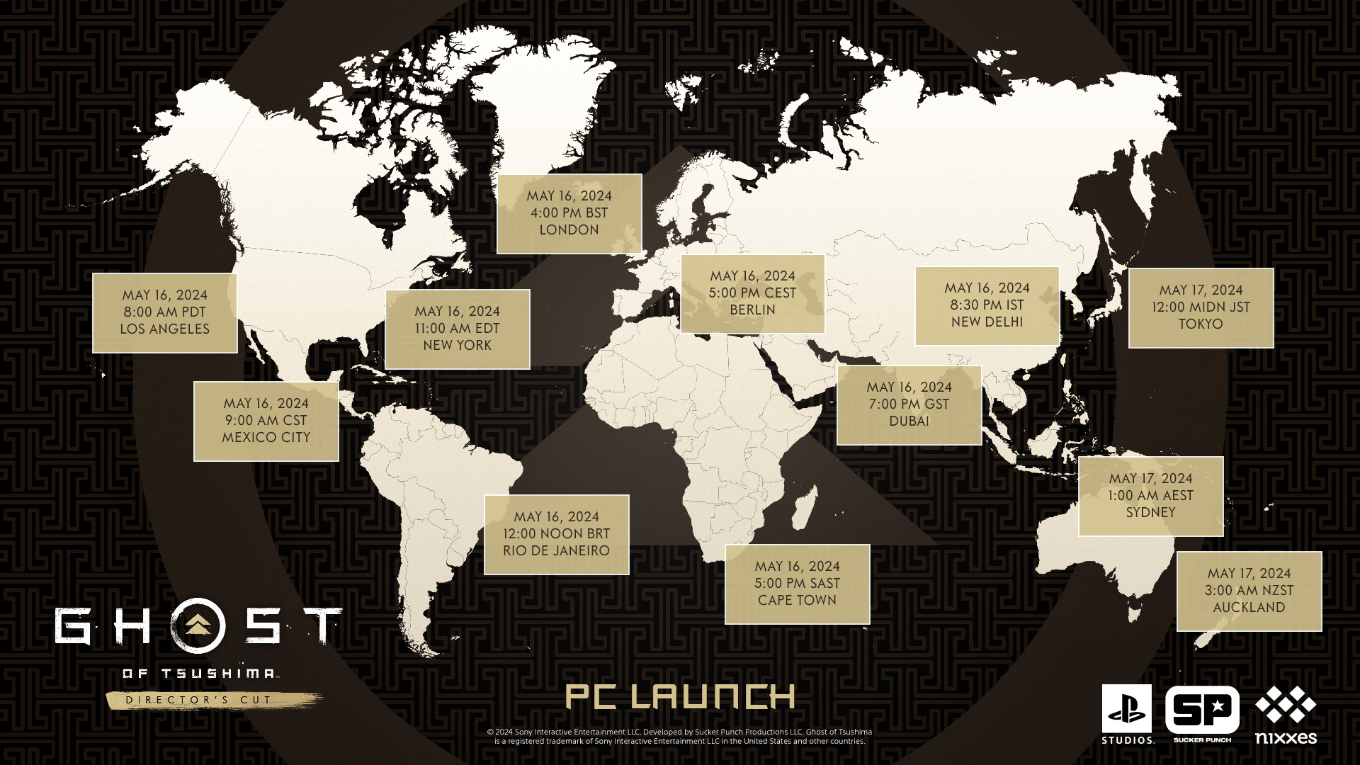 You can now pre-load the game on Steam. By doing so, you can download the game ahead of its release on May 16. Ghost of Tsushima Director's Cut launches on May 16 at 8:00 AM PDT / 5:00 PM CEST / 7:00 PM GST. Check out the infographic below for more time zones (click to enlarge).