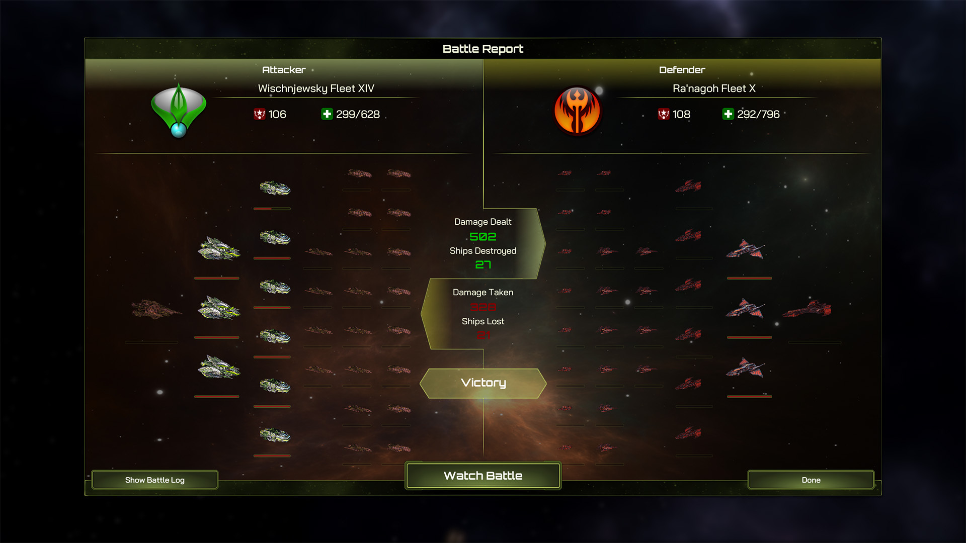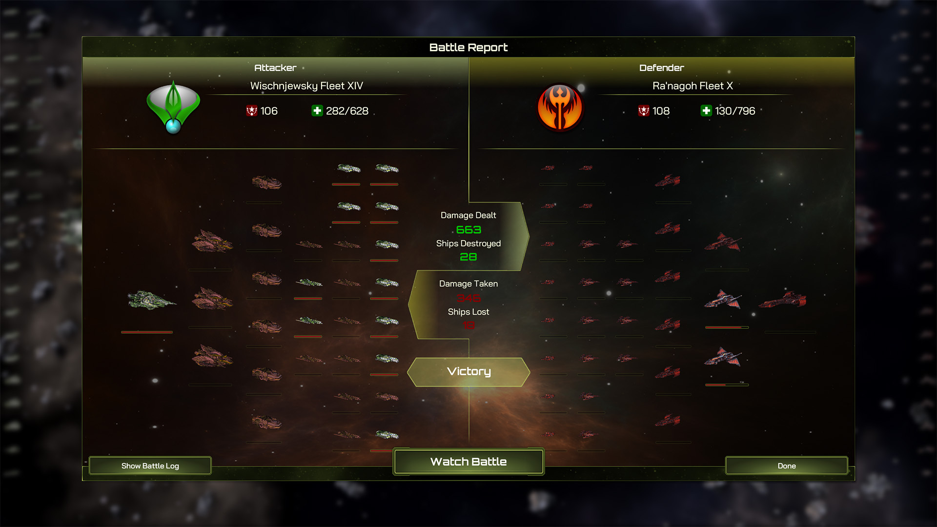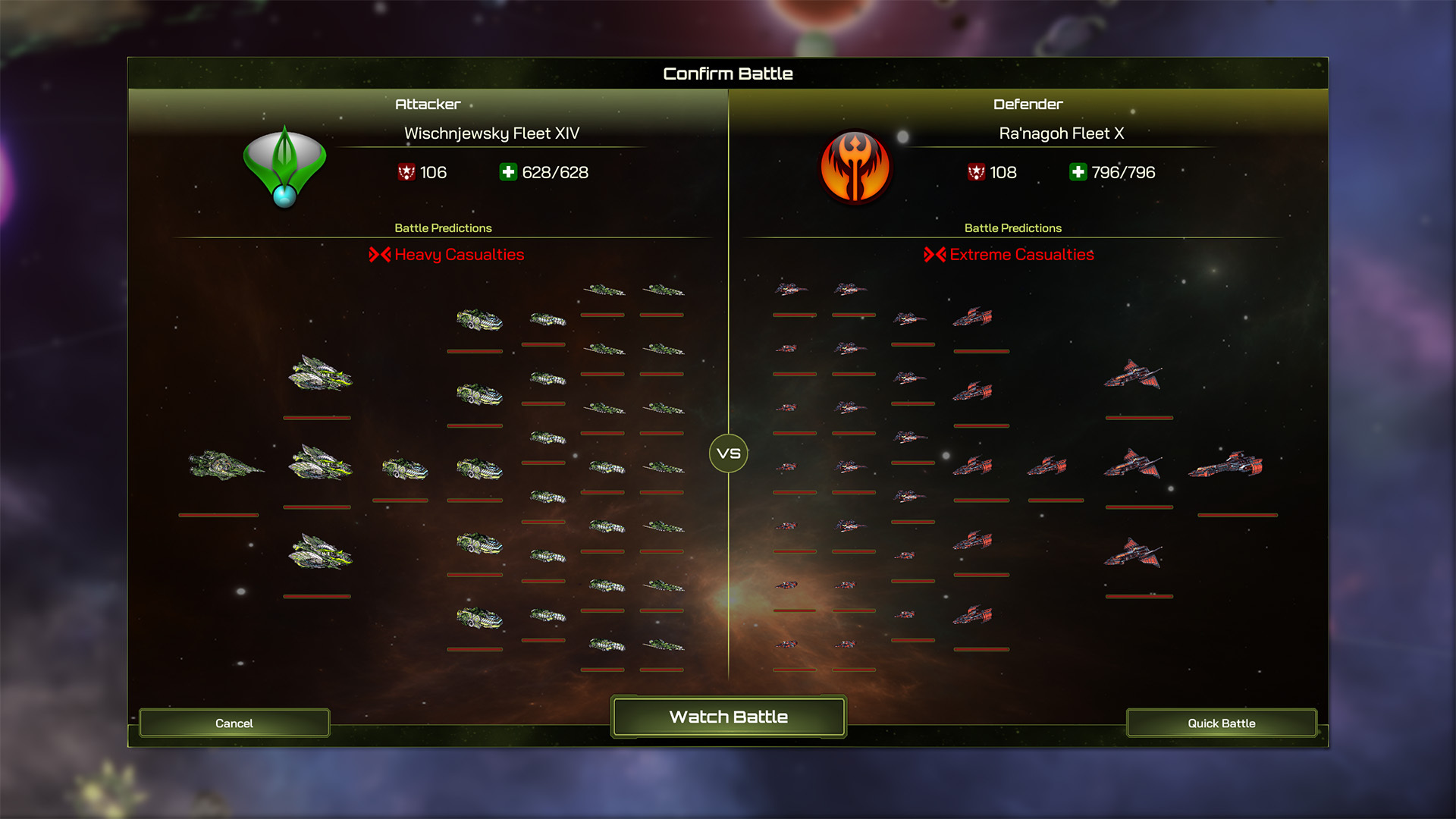 The two opposing fleets prepare to engage, showing an estimate of the final result. Baratak look to come out on top this time…