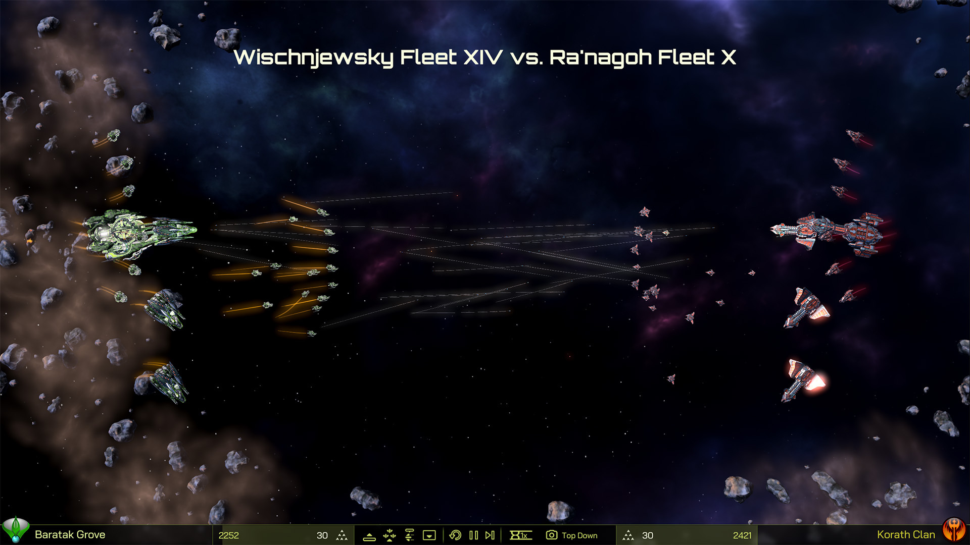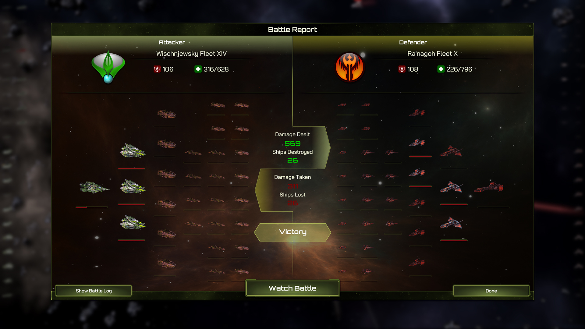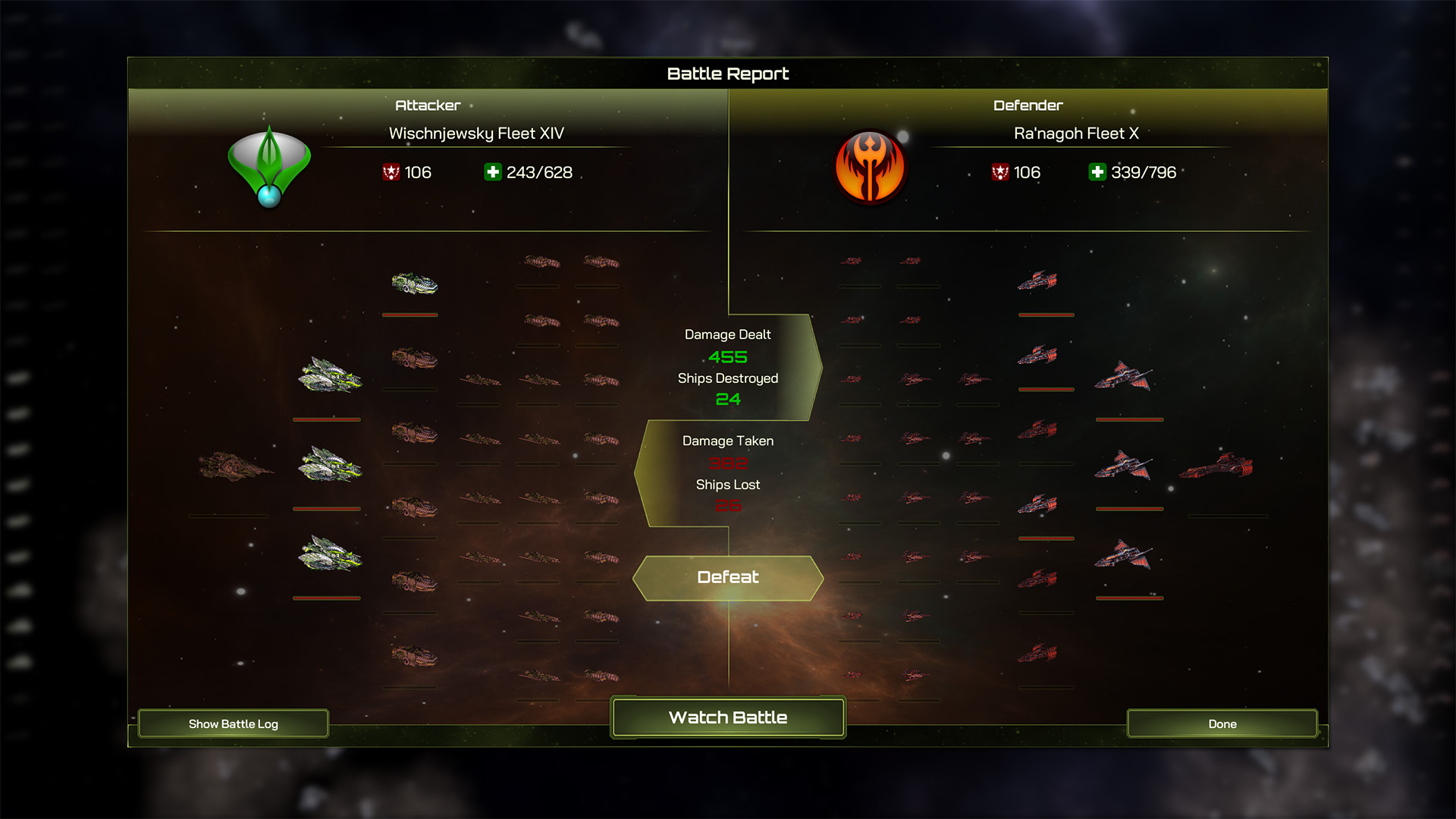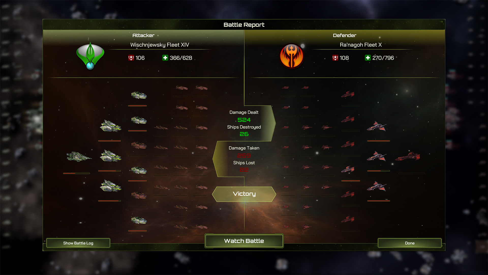 The two opposing fleets prepare to engage, showing an estimate of the final result. Baratak look to come out on top this time…