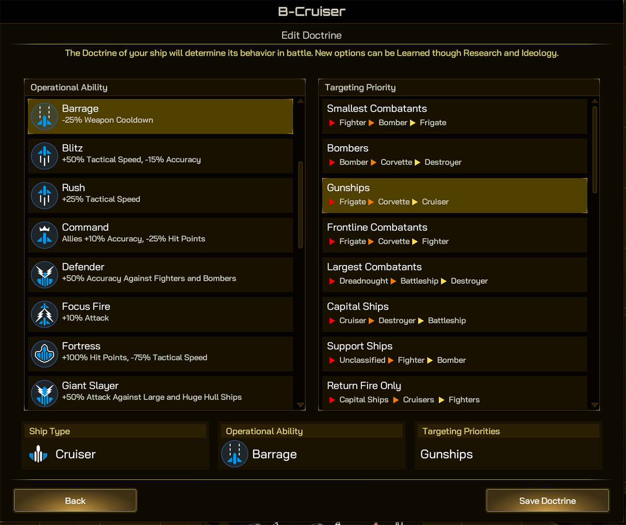 For those of you that missed the previous journals, a Ship Class is a Ship Type plus a Doctrine, and a Doctrine is an Operational Ability plus a Targeting Priority.