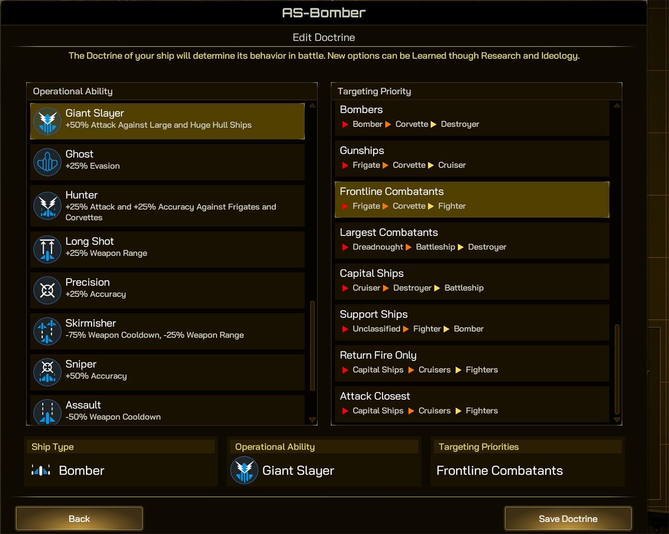 Firstly, I’ve kept the Targeting Priorities as their Type-based default: remember, with the Warlords expansion you can change each Classes Targeting Priority to something new but each Type has a default setting. The Fighter defaults to Smallest Combatants (targeting Fighters first, then Bombers, then Frigates, then Corvettes and afterwards whatever else is left), the Bomber to Largest Combatants (Dreadnaught -> Battleship -> Destroyer -> Cruiser), the Frigate to Bombers (Bomber -> Corvette -> Destroyer -> Battleship), the Cruiser to Smallest Combatants and the Battleship to Largest Combatants.