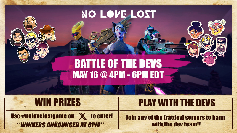 Join any [ratdev] servers on May 16th @ 4 PM EDT to play with the dev team + use # nolovelostgame on X during the event for a chance to win a prize! We'll be DMing a winner there at 6 PM EDT!