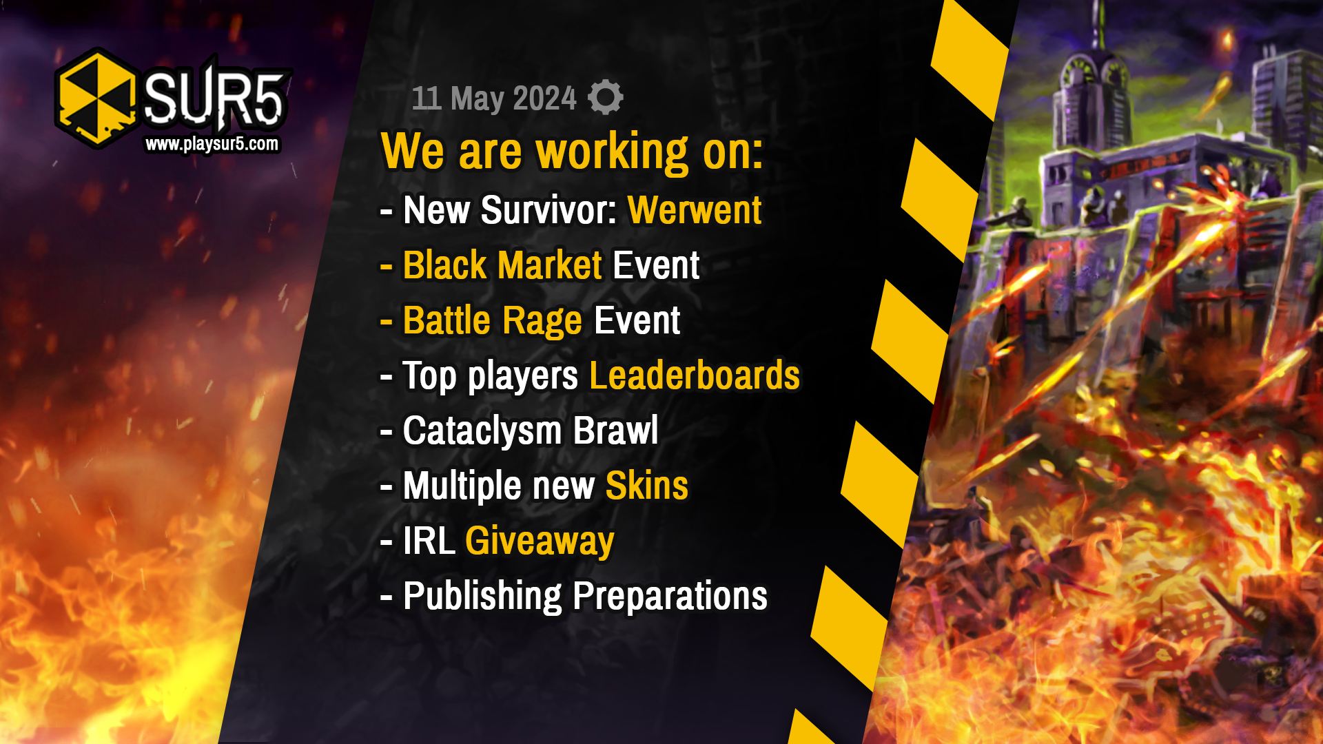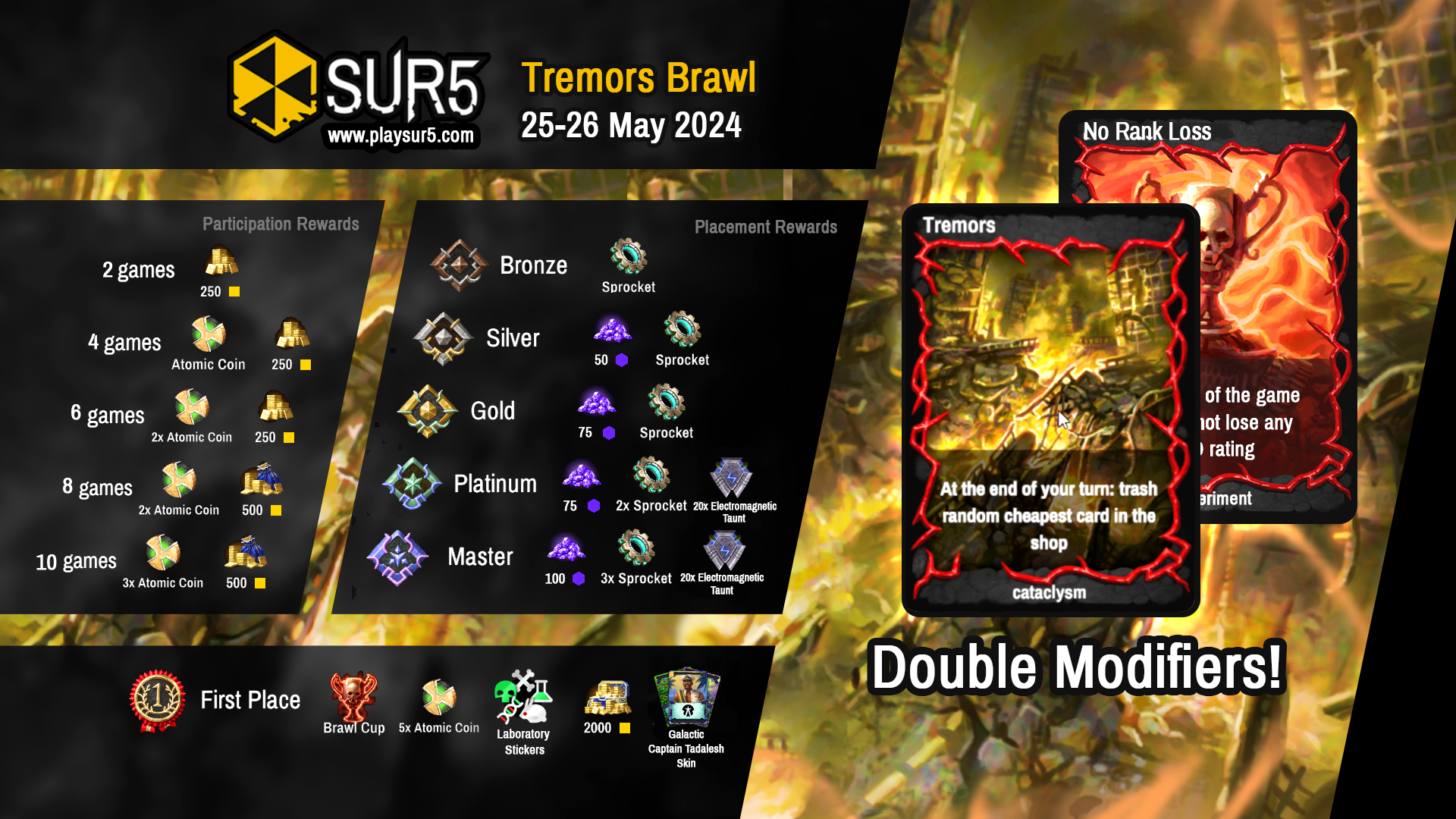25-26 May 2024 17:00 CET we are launching our first Double Brawl. Yes, two modificators at once! This is only a fraction of power that the SUR5 engine possesses. During this event you will not lose any ELO ranking and will play with fan-favourite cataclysm: Tremors! We also decided to reduce the number of games that are required to obtain participation prizes.
