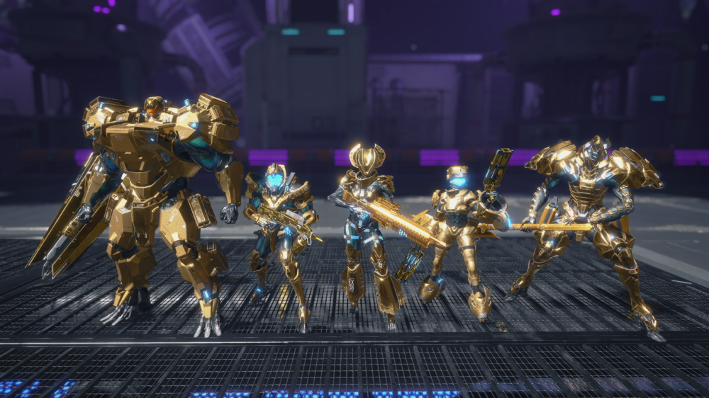 Also, by spending Golden Tickets that you obtain, you can purchase special golden suit skins and weapon skins from the Exosuit Screen in the Hanger.