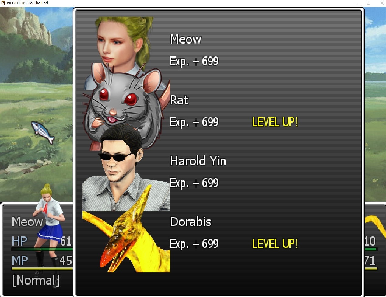 English ############Content############### [Battle]As we now have more things to display in the post-battle screen, the result window has been split into two. One for experience and one for loots. [Battle]The experience window shall display every character's exp gain separately. The number shall now be posted to all modifiers including the game setting or any modifiers on the characters. Thus, each character in your group may gain a different amount of experience for each battle. [Battle]If a character levels up, such information will be displayed in the experience window. [Battle]The loot window now displays the loot you gained only. [Battle]Those 2 windows respect the game setting of automatically making them disappear without the need for any confirmation inputs if you desire. ############System################ Added a more versatile popup class taking a window class as a parameter and an array as a parameter of that window class that can use any window class as a temporary popup. 简体中文 ##########Content################# 【战斗】因为我们在战斗结束后显示的信息变多了,所以战斗结束的报告窗口现在被分成了两个,一个显示获得的经验,另外一个显示掉落物。 【战斗】战斗后获得的经验窗口会对每个队伍中的成员获得的经验单独显示,并且经验值是所有的包括游戏设定、角色身上的修正进行调整之后的数值。因此,队伍中每个角色在一次战斗中获得的经验可能不同。 【战斗】如果有角色升级,则也会显示在战斗后的经验窗口中。 【战斗】掉落物窗口将会只显示你获得的物品。 【战斗】上述两个窗口会遵循你进行的游戏设定,可以设置为无需输入,在一段时间后自动消失的状态。 ############System################ 加入了一种更为通用的窗口显示类,使用一个窗口类作为参数,一个数组作为这个窗口类的参数的参数,从而可以在游戏中显示任何的窗口作为临时的弹窗。