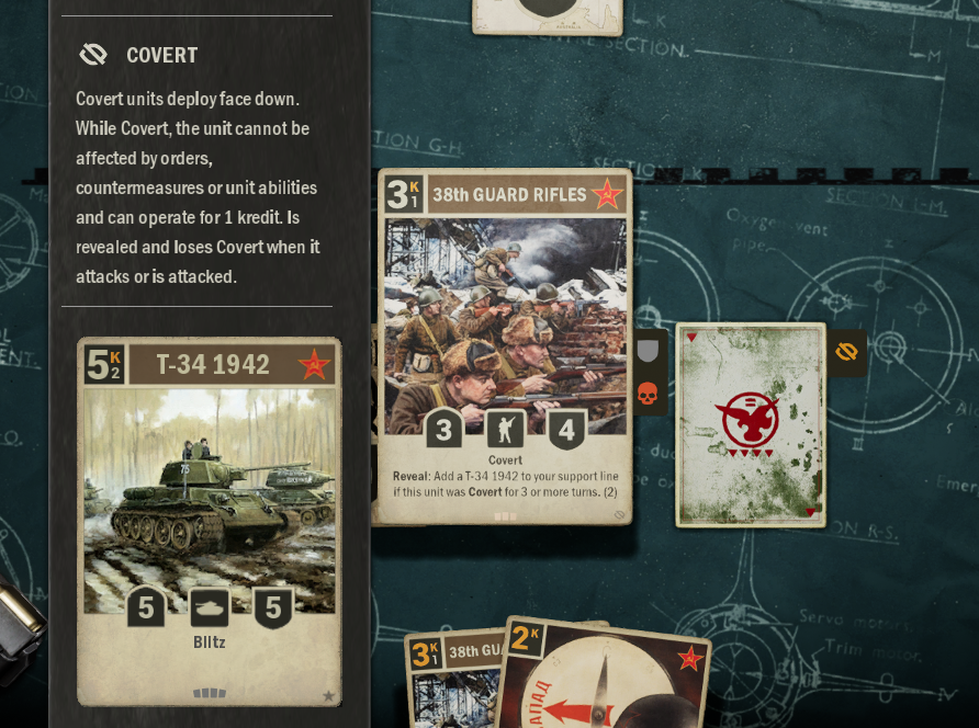 SU-100 Blitz Tank: A notable unit in Soviet decks, the SU-100 blitz tank benefits from the Counter Offensive archetype but also grows stronger when damaged. This mechanic encourages players to take calculated risks, using the tank’s status to absorb hits and then counterattacking with increased power. While this is not a covert card, it is one of several mini themes in the Soviet arsenal