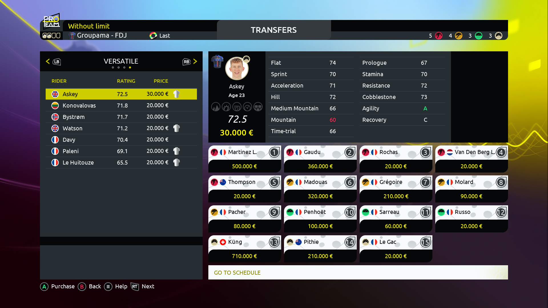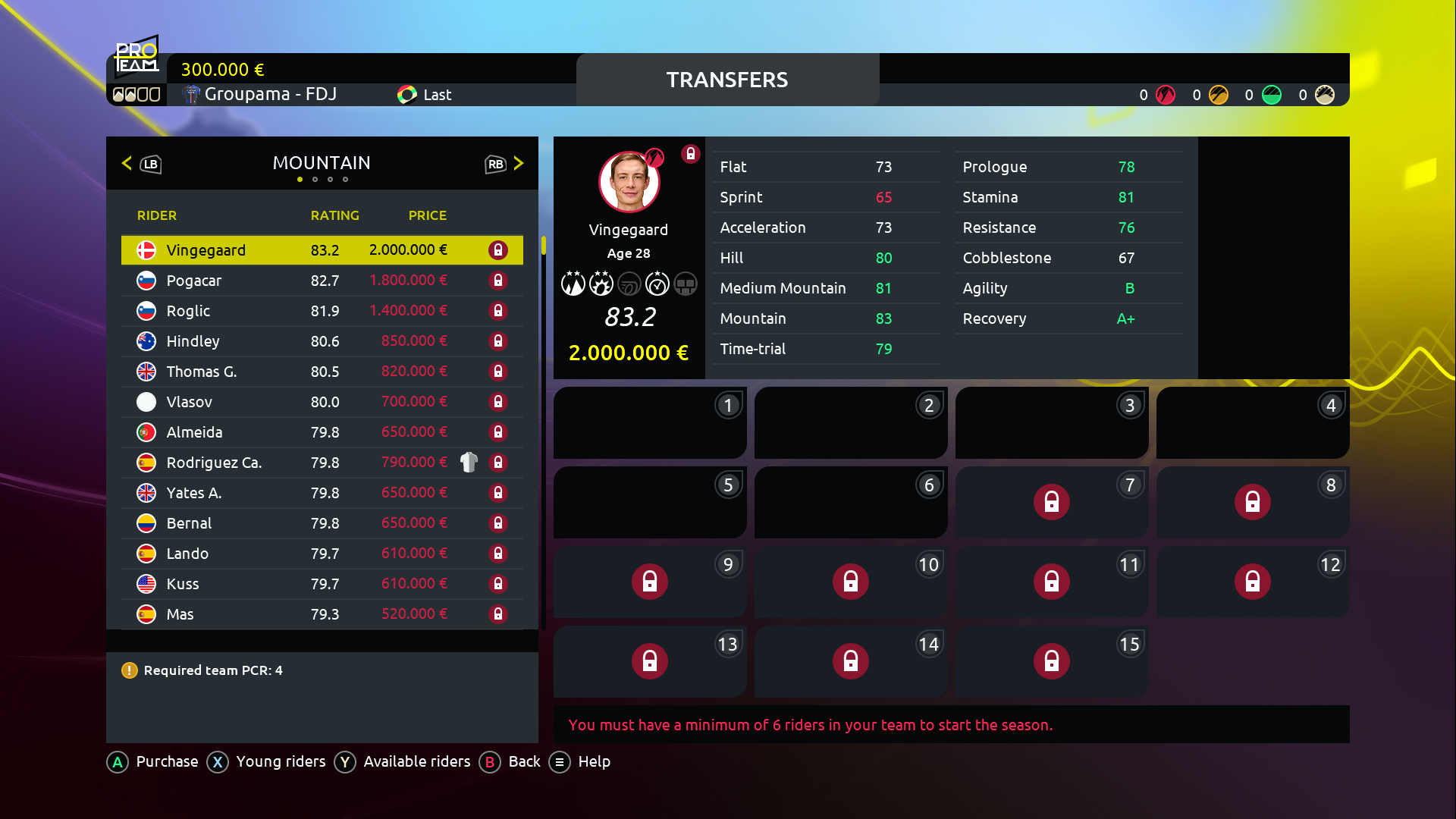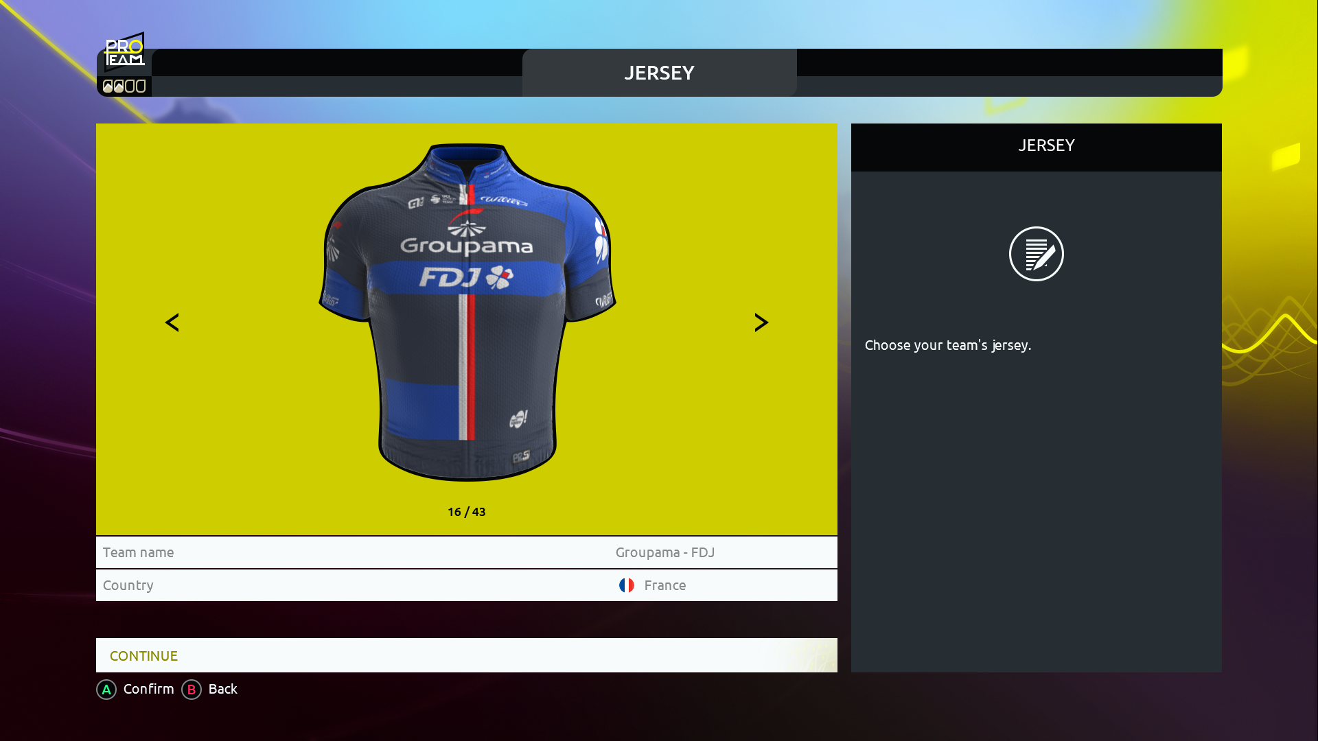 With the first option, you'll enjoy the same Pro Team experience but have the chance to wear the colours of your favourite team. For example, you can play as Groupama-FDJ, but your budget will be restricted, and only a few riders from various teams will be available.