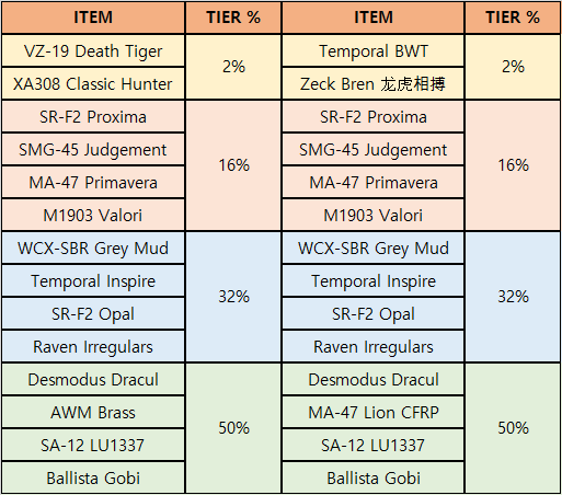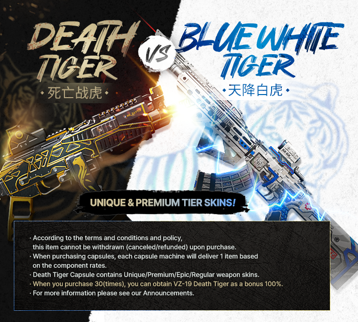 Please note that: The Death Tiger Capsule contains Unique, Premium, Epic, and Regular tier weapon skins which can be used in Skin Combination System.[/b] When you purchase 30 times of the capsule, you will obtain the VZ-19 Death Tiger(100%) as a bonus.