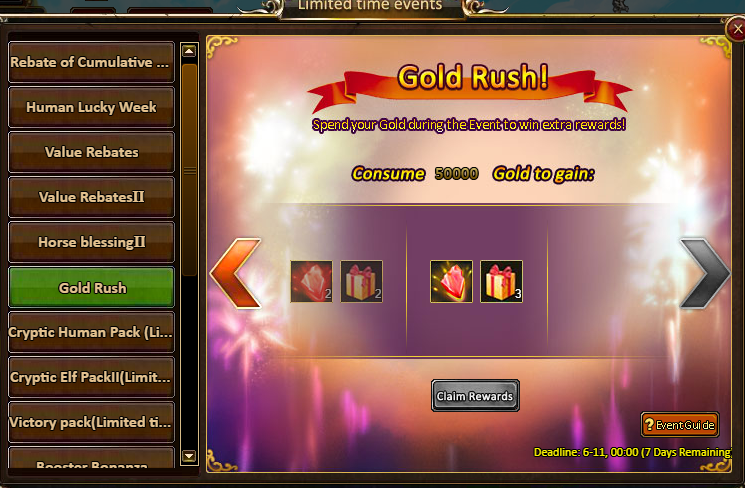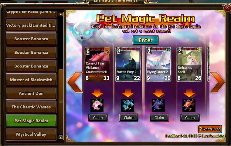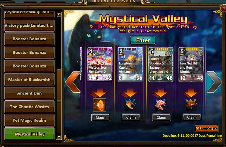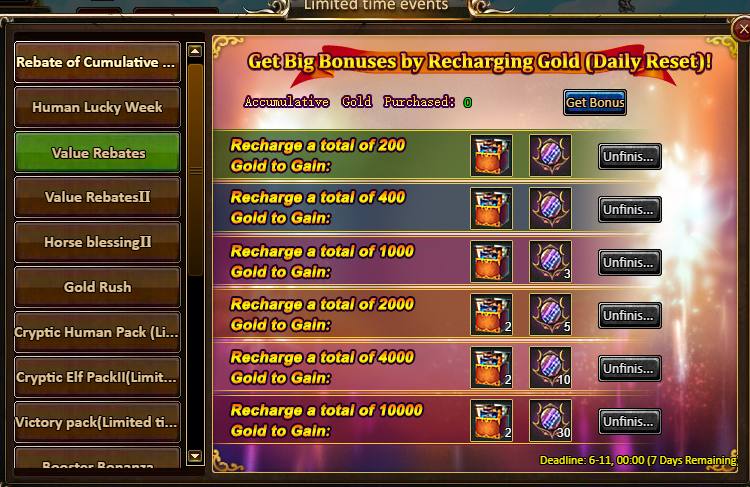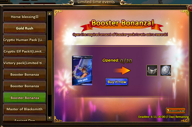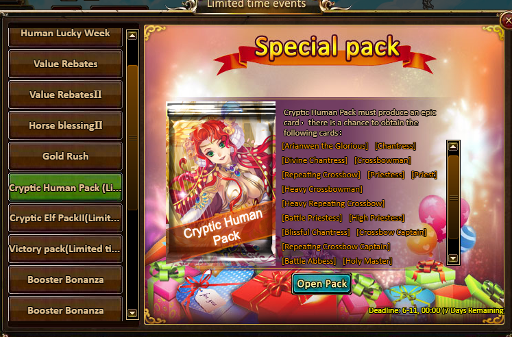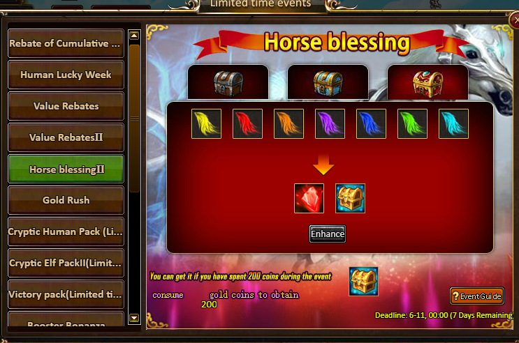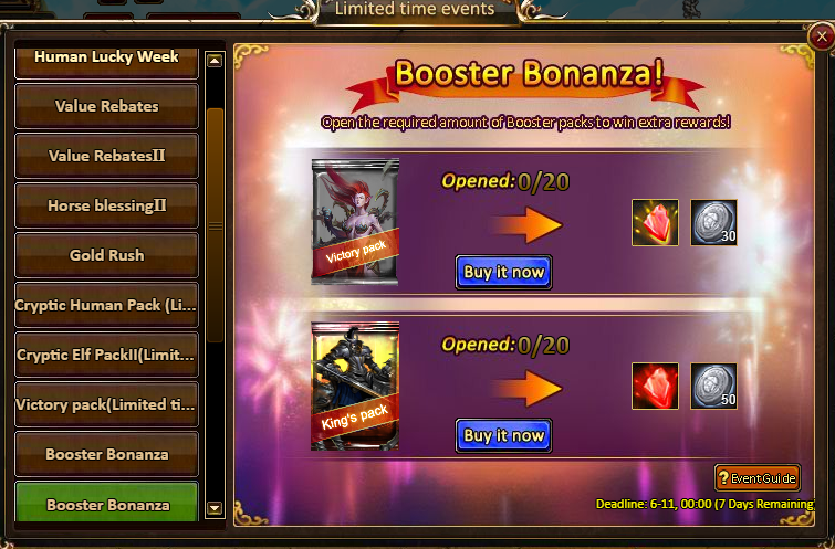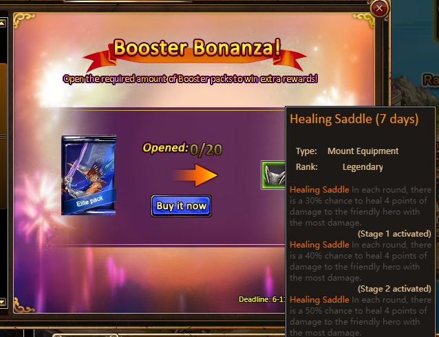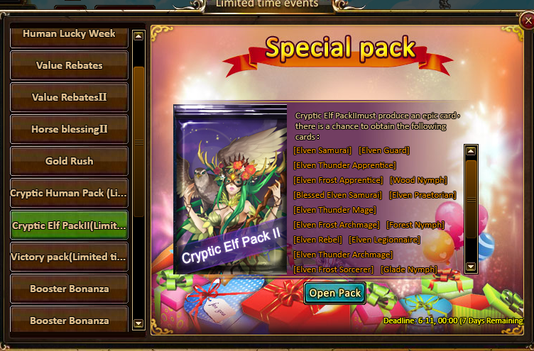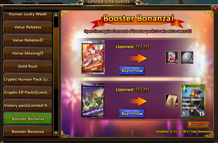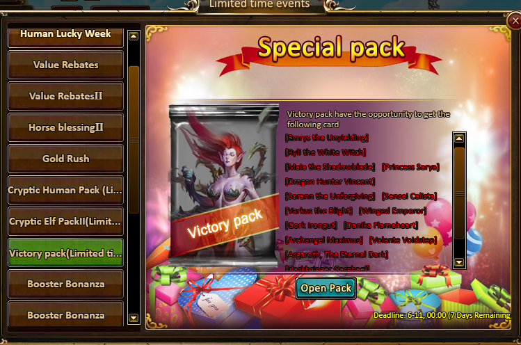 1.Rebate of Cumulative Recharge Gold: 9000 - Cancer (Legendary) / 35000 - Cancer (Godlike) 2.Secrets of the Tarot (The Chariot of War) 3.Value Rebates 4.Event of Horse Hair 5.Special Offer Shop 6.Gold Rush 7.Pack (Limited Time Event) 8.Booster Bonanza 20 packs of Mysterious Human Packs - Festival Packs*5 / Silver*100,000 20 packs of Mysterious Elf Packs II - Velyn the Unscarred (Legendary) / Tower Ticket*10 20 packs of Victory Packs - Black Opal*1 / Silver*3,000,000 20 packs of King’s Packs - Fire Ruby*1 / Silver*500,000 20 packs of Elite Packs - Healing Saddle (7 Days)*1 / Silver*50,000 9.Master Blacksmith 10.Ancient Den 11.Chaotic Wastes 12.Pet Magic Realm 13.Mystical Valley 14.Page 5 of Backpack