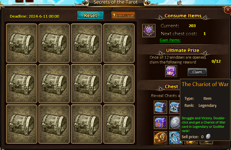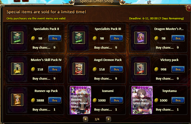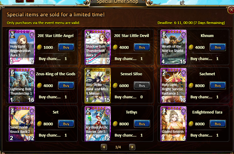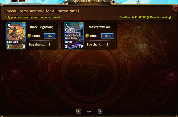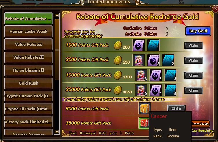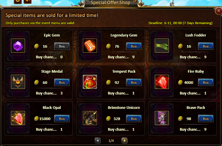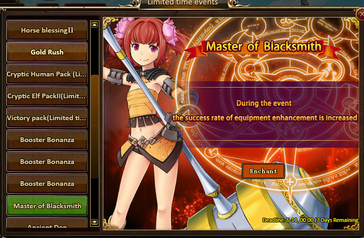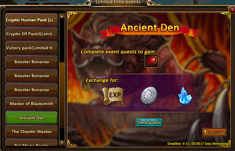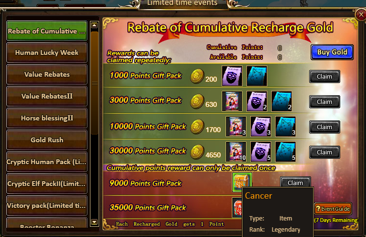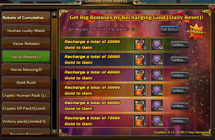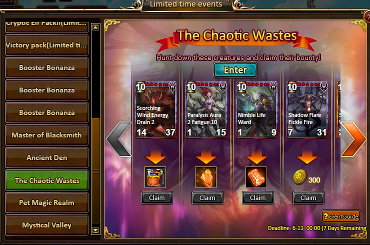 1.Rebate of Cumulative Recharge Gold: 9000 - Cancer (Legendary) / 35000 - Cancer (Godlike) 2.Secrets of the Tarot (The Chariot of War) 3.Value Rebates 4.Event of Horse Hair 5.Special Offer Shop 6.Gold Rush 7.Pack (Limited Time Event) 8.Booster Bonanza 20 packs of Mysterious Human Packs - Festival Packs*5 / Silver*100,000 20 packs of Mysterious Elf Packs II - Velyn the Unscarred (Legendary) / Tower Ticket*10 20 packs of Victory Packs - Black Opal*1 / Silver*3,000,000 20 packs of King’s Packs - Fire Ruby*1 / Silver*500,000 20 packs of Elite Packs - Healing Saddle (7 Days)*1 / Silver*50,000 9.Master Blacksmith 10.Ancient Den 11.Chaotic Wastes 12.Pet Magic Realm 13.Mystical Valley 14.Page 5 of Backpack