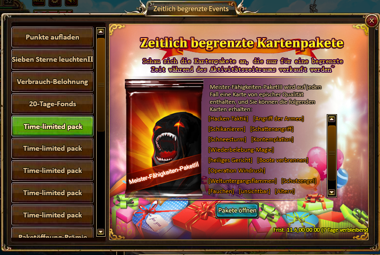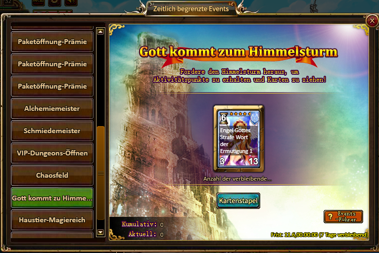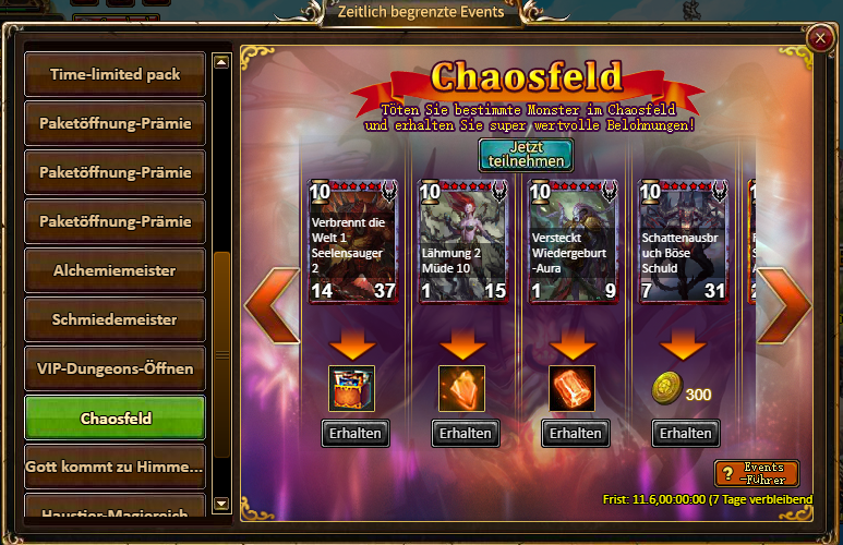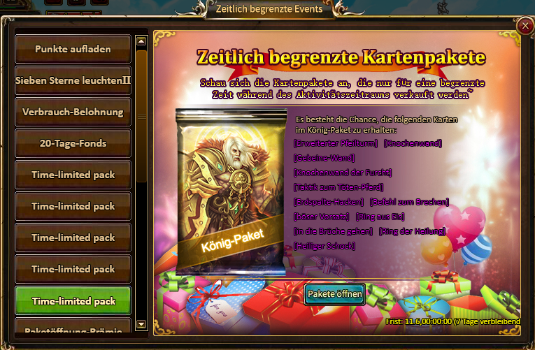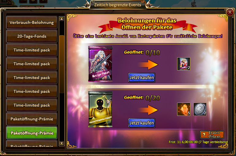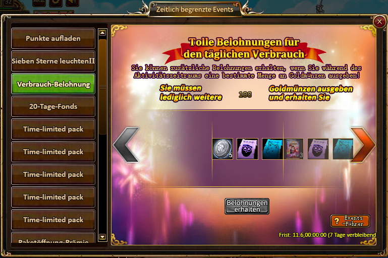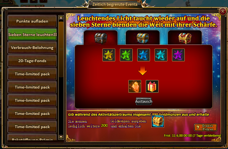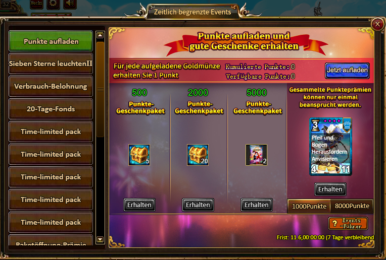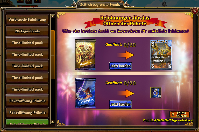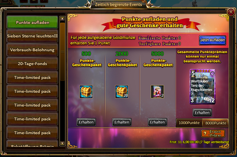 1. Punkte aufladen: Segelmädchen Luika (episch), Schwerttanz Philos (legendär) 2. Sieben Sterne leuchten II 3. Verbrauch-Belohnung 4. 20-Tage-Fonds 5. Time-Limited pack 6. Paketöffnung-Prämie Belohnungen für das 5-malige Öffnen von Meister-Fähigkeiten-Paket III: Manny der Unruhestifter (episch) *1 Belohnungen für das 20-malige Öffnen von Berufssoldat-Paket III: Manny der Unruhestifter (legendär) *1 Belohnungen für das 10-malige Öffnen von Mutige-Paket: Festival-Paket*2 Belohnungen für das 20-malige Öffnen von Meister-Fähigkeiten-Paket IV: Legendärer Alchemiestein*5, 100,000 Silbermünzen*2 Belohnungen für das 20-malige Öffnen von König-Paket: Ben Regela (legendär) *1 Belohnungen für das 20-malige Öffnen von Elite-Paket: Elite-Paket*10 7. Alchemiemeister 8. Schmiedemeister 9. VIP-Dungeons-Öffnen 10. Chaosfeld 11. Gott kommt zu Himmelsturm 12. Haustier-Magiereich 13. Mystisches Tal 14. Datenmigration