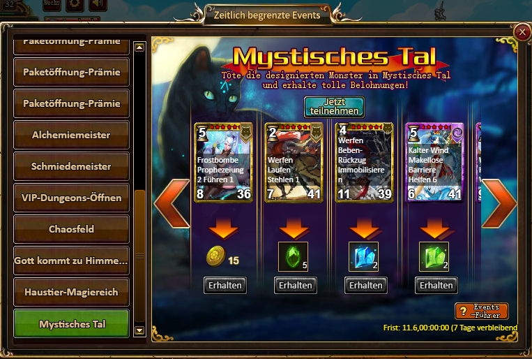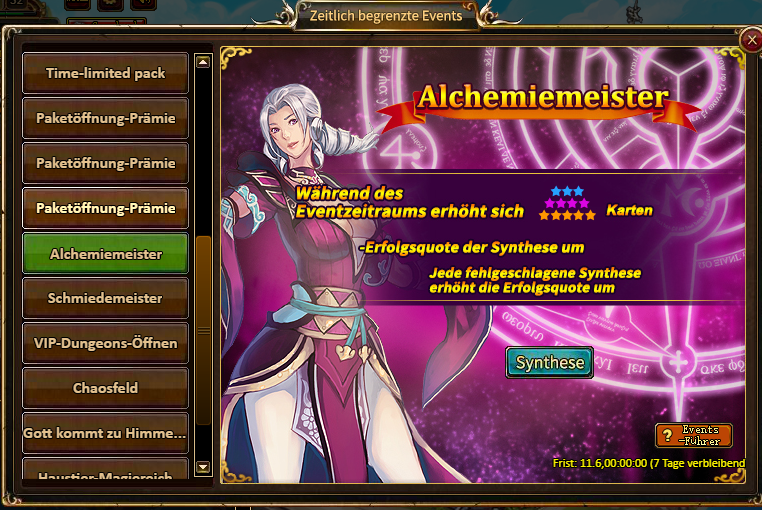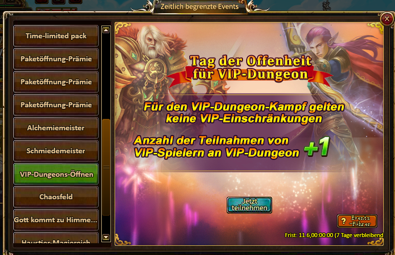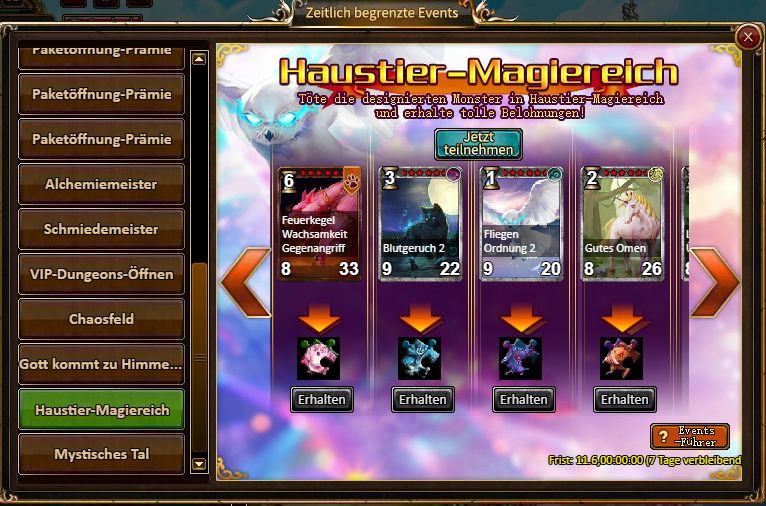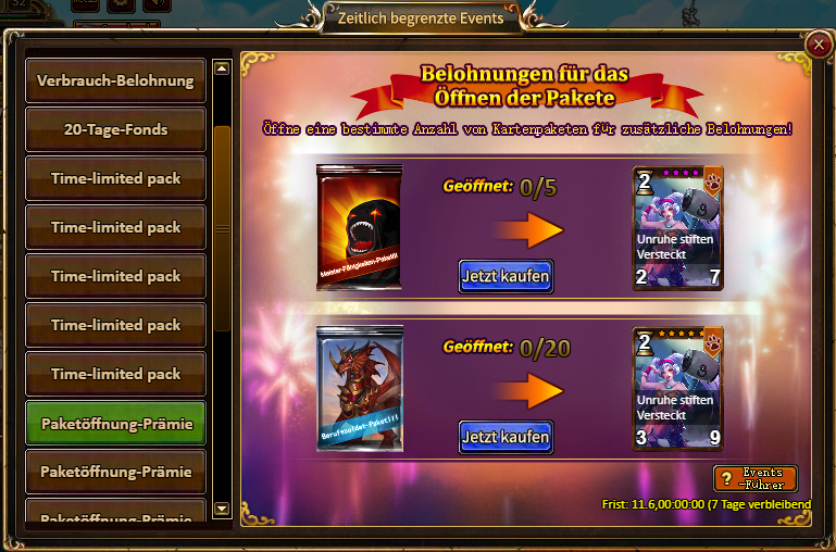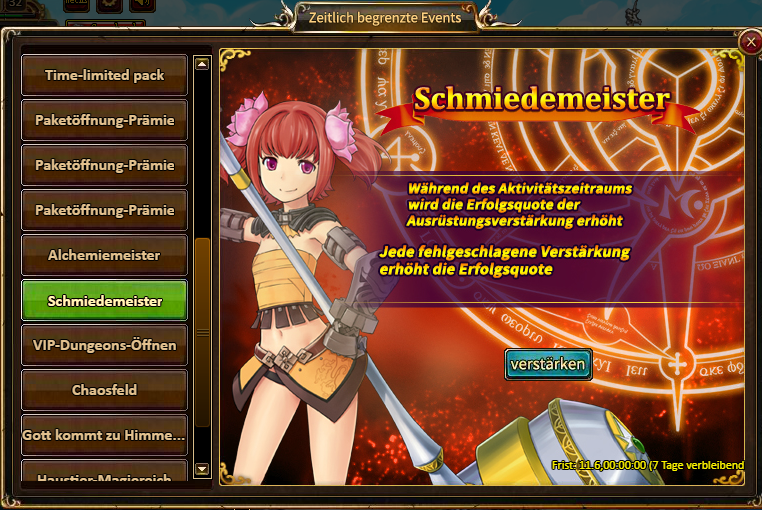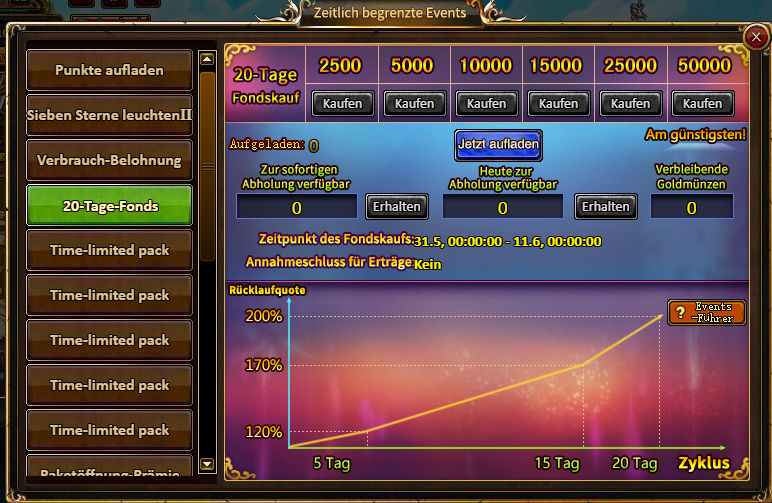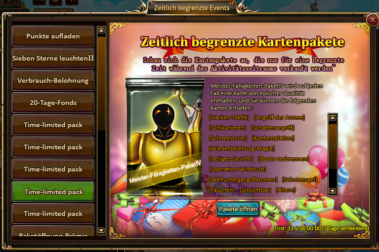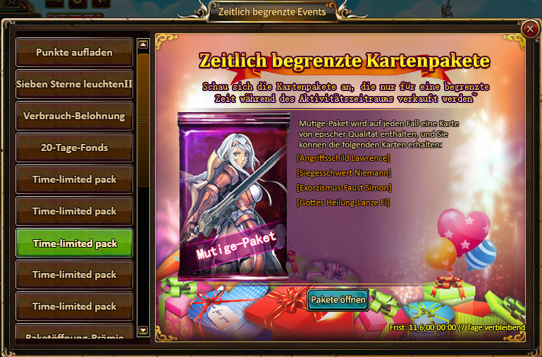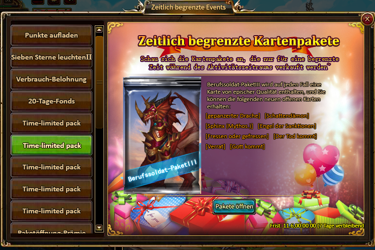 1. Punkte aufladen: Segelmädchen Luika (episch), Schwerttanz Philos (legendär) 2. Sieben Sterne leuchten II 3. Verbrauch-Belohnung 4. 20-Tage-Fonds 5. Time-Limited pack 6. Paketöffnung-Prämie Belohnungen für das 5-malige Öffnen von Meister-Fähigkeiten-Paket III: Manny der Unruhestifter (episch) *1 Belohnungen für das 20-malige Öffnen von Berufssoldat-Paket III: Manny der Unruhestifter (legendär) *1 Belohnungen für das 10-malige Öffnen von Mutige-Paket: Festival-Paket*2 Belohnungen für das 20-malige Öffnen von Meister-Fähigkeiten-Paket IV: Legendärer Alchemiestein*5, 100,000 Silbermünzen*2 Belohnungen für das 20-malige Öffnen von König-Paket: Ben Regela (legendär) *1 Belohnungen für das 20-malige Öffnen von Elite-Paket: Elite-Paket*10 7. Alchemiemeister 8. Schmiedemeister 9. VIP-Dungeons-Öffnen 10. Chaosfeld 11. Gott kommt zu Himmelsturm 12. Haustier-Magiereich 13. Mystisches Tal 14. Datenmigration