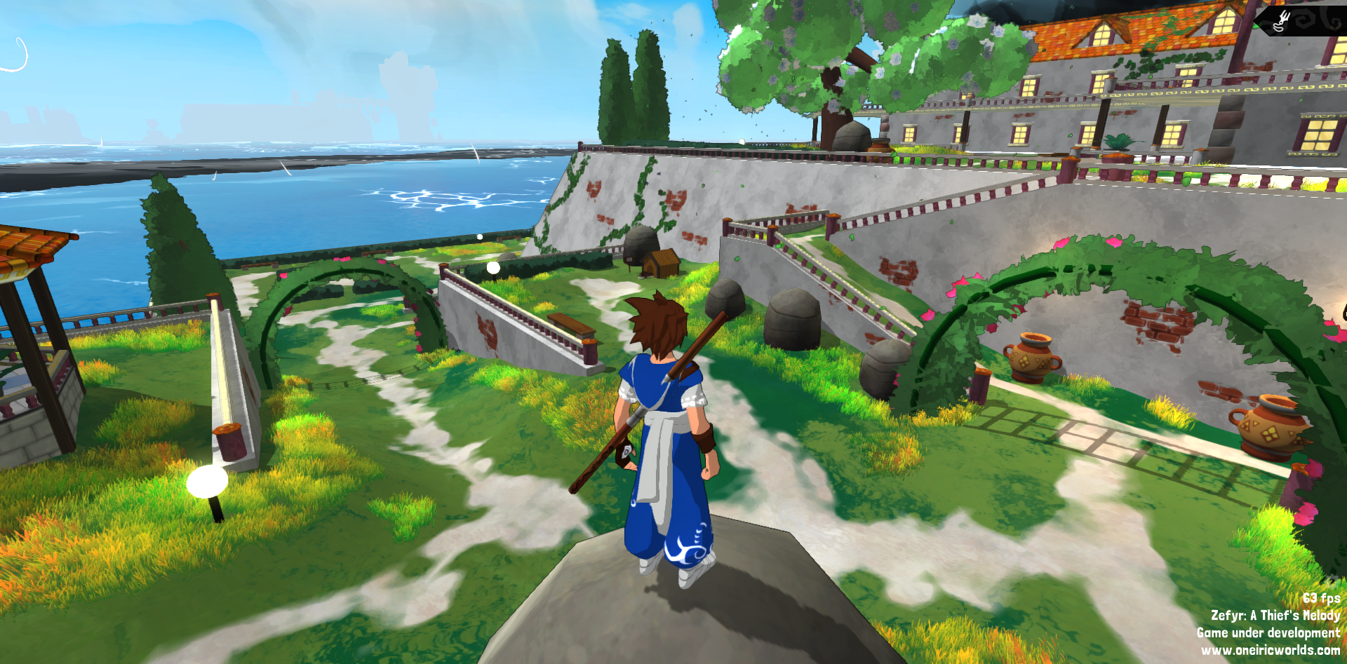 First, I took some time to rework some pretty old levels. They were functional but a bit empty and rough around the edges. I mainly worked on a mansion, a snowy tower, and a pirate chase (no precise names to avoid spoilers). I added grass, trees, ivy, rocks, lights, benches, dialogues, paths, animals, and various other details. I also fixed lots of little bugs and reworked some cutscenes (positioning, behaviors, missing elements). I can’t describe everything, but here are a few screens: