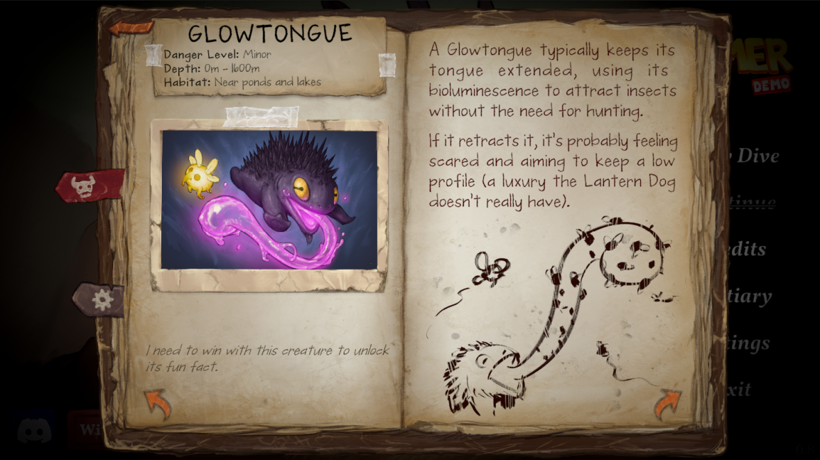 Ever wanted to know how each of the creatures in Decktamer lives in their natural habitat? Now you can! The bestiary is a giant in-game encyclopedia of all the creatures of the abyss. It is written as you play, from the point of view of your character. At first, the bestiary is completely empty, but you can fill it by taming creatures while playing. What’s more, if you manage to beat the game while having a given creature in your deck, you can unlock a fun fact about it (and a little star that goes with it)!