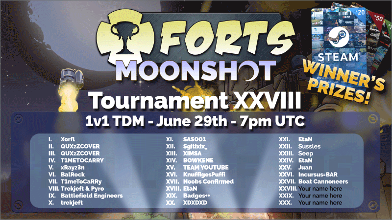Registration will open at 7pm UTC tomorrow (18th of June). In order to register, every participant should ping 42scientist on the Forts Official Discord server with their challengermode profile, and then be invited on Challengermode.