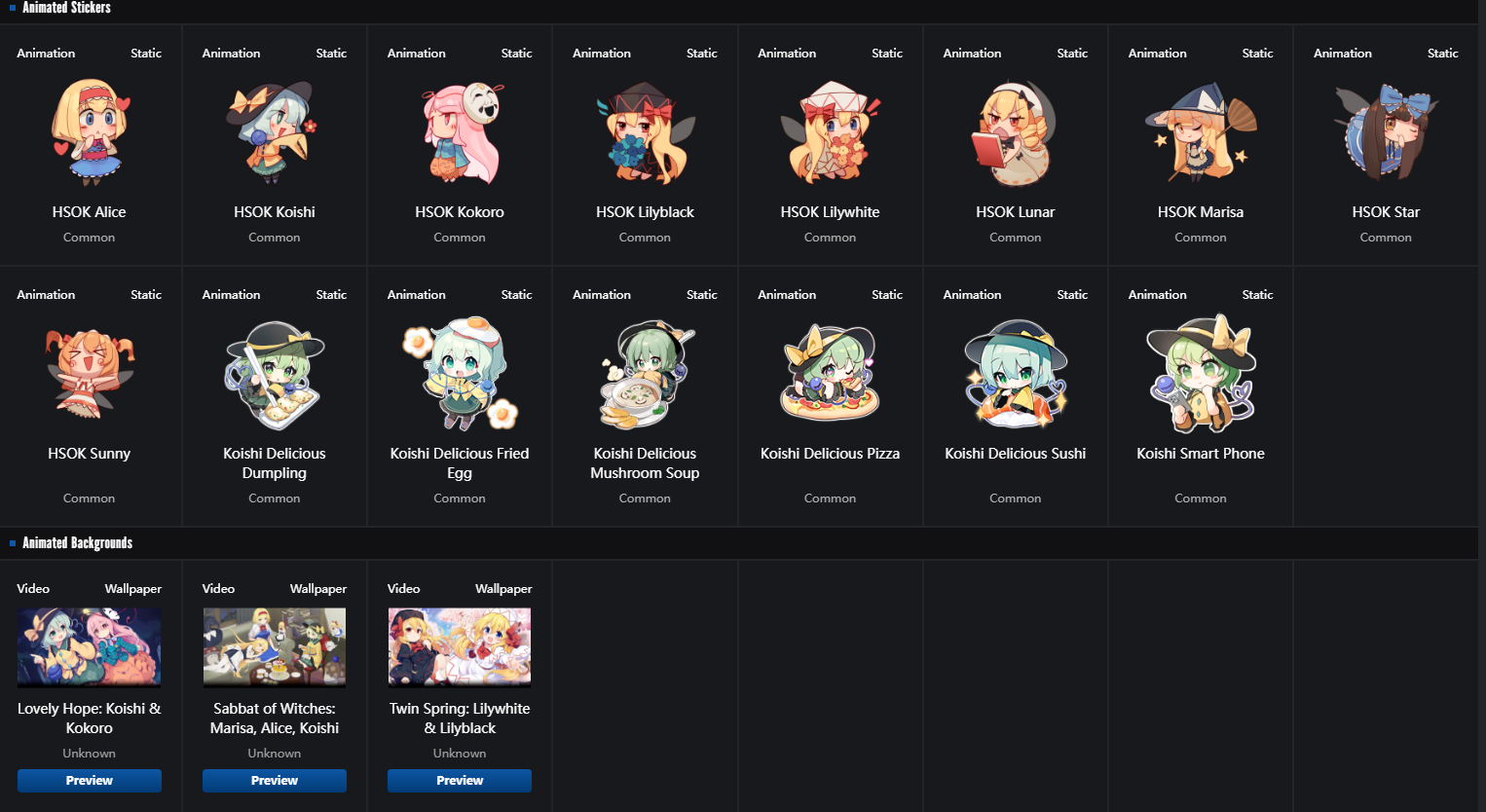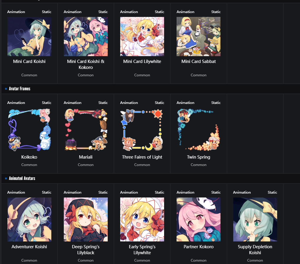 Because some things were delayed for a long time, point store of Halluci-Sabbat of Koishi finally meet everyone~ we added 12 cards, 10 emoticons, and 9 static backgrounds The points store has 3 MP4 dynamic backgrounds, 4 mini profile dynamic backgrounds, 15 dynamic stickers, 4 avatar frames, and 5 dynamic avatars! All of them were created with our utmost effort, and I like it. Everyone can enjoy it