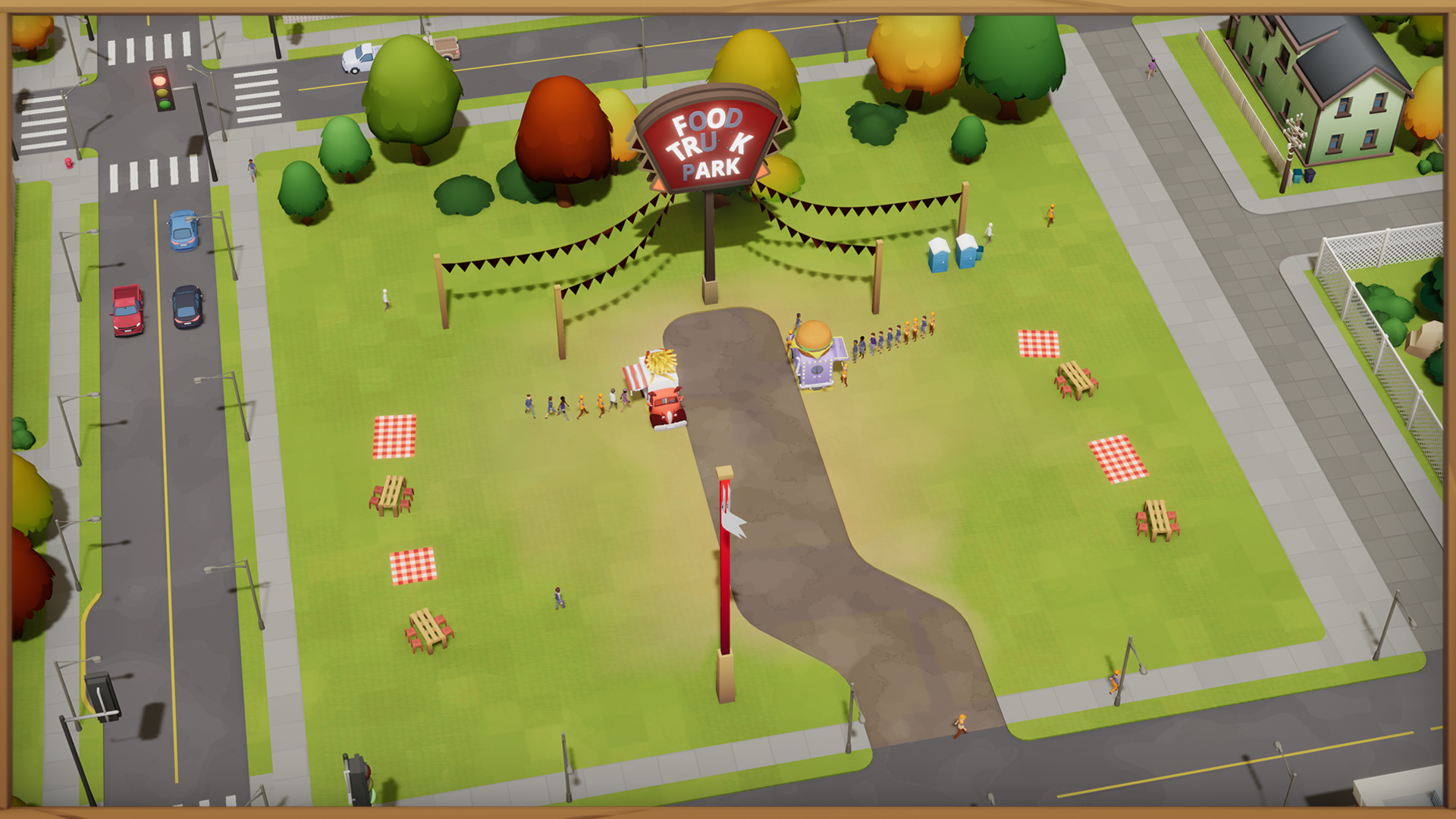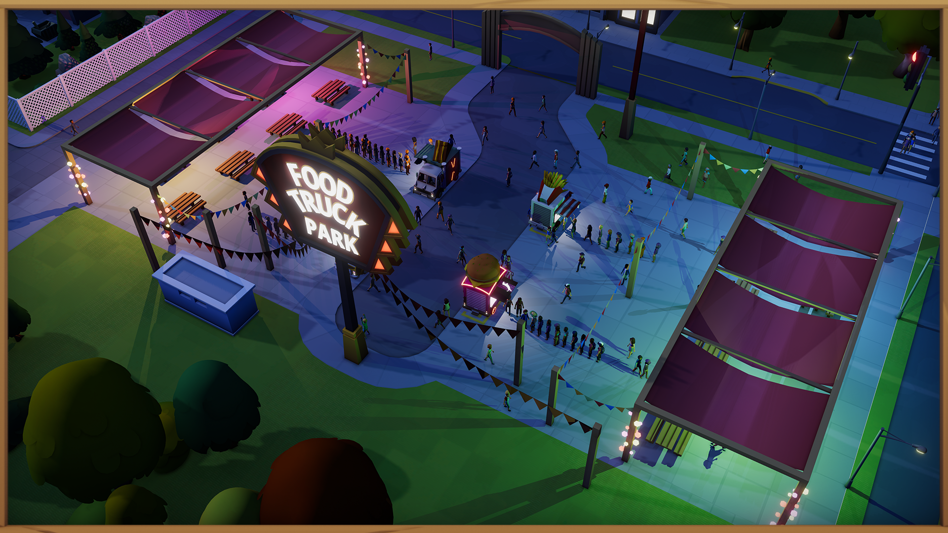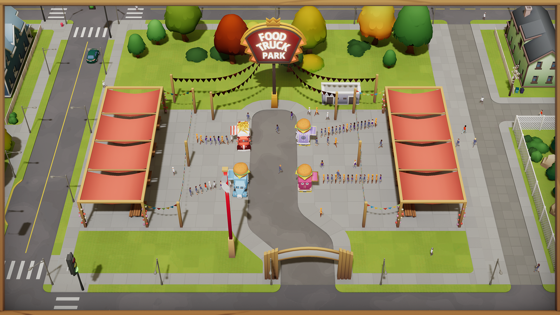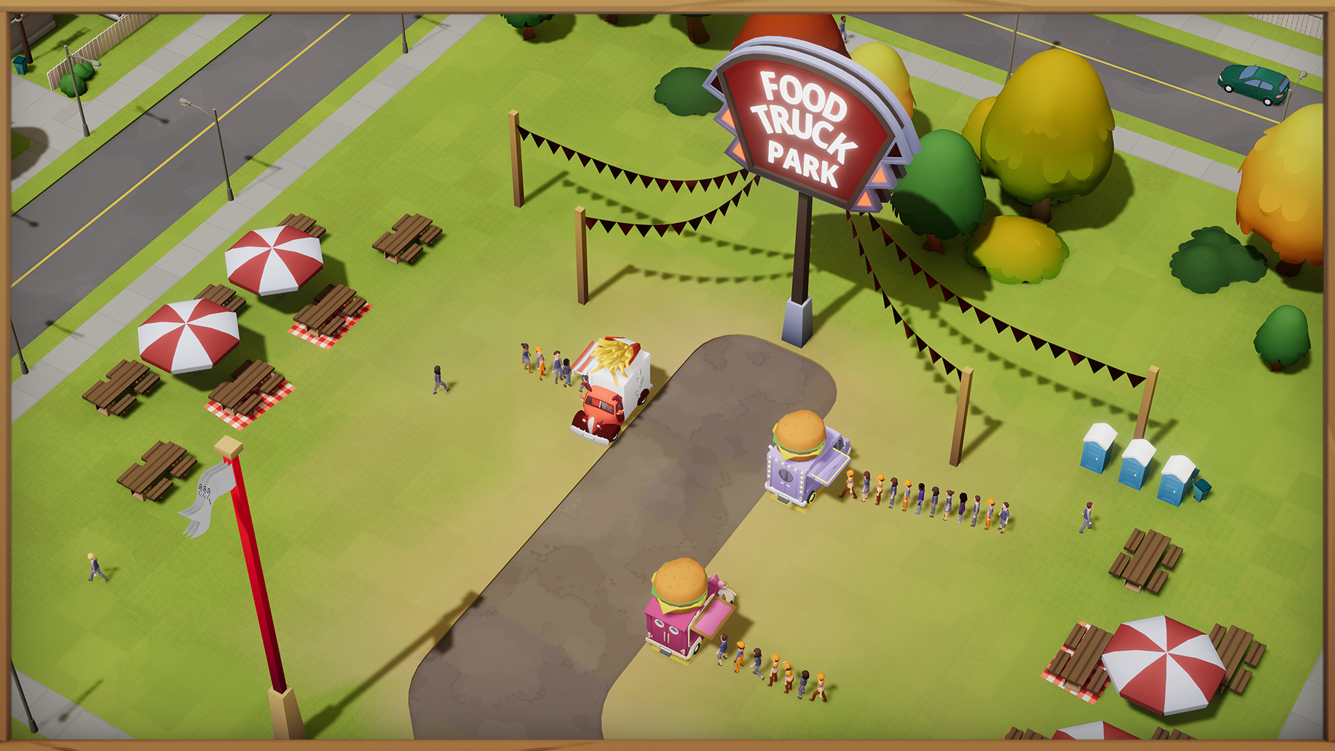 Food Parks, or Food Courts if you are fancy, are essentially a place for more than one food truck to serve customers. People come to you and your food trucks rather than the other way around. That makes it simpler to bring stable profit without having to worry about route optimization. Each Food Park has their range (which can be upgraded with level-ups), which covers some area around the park itself, so people from nearby streets will know where to go to when hungry. 🍽️