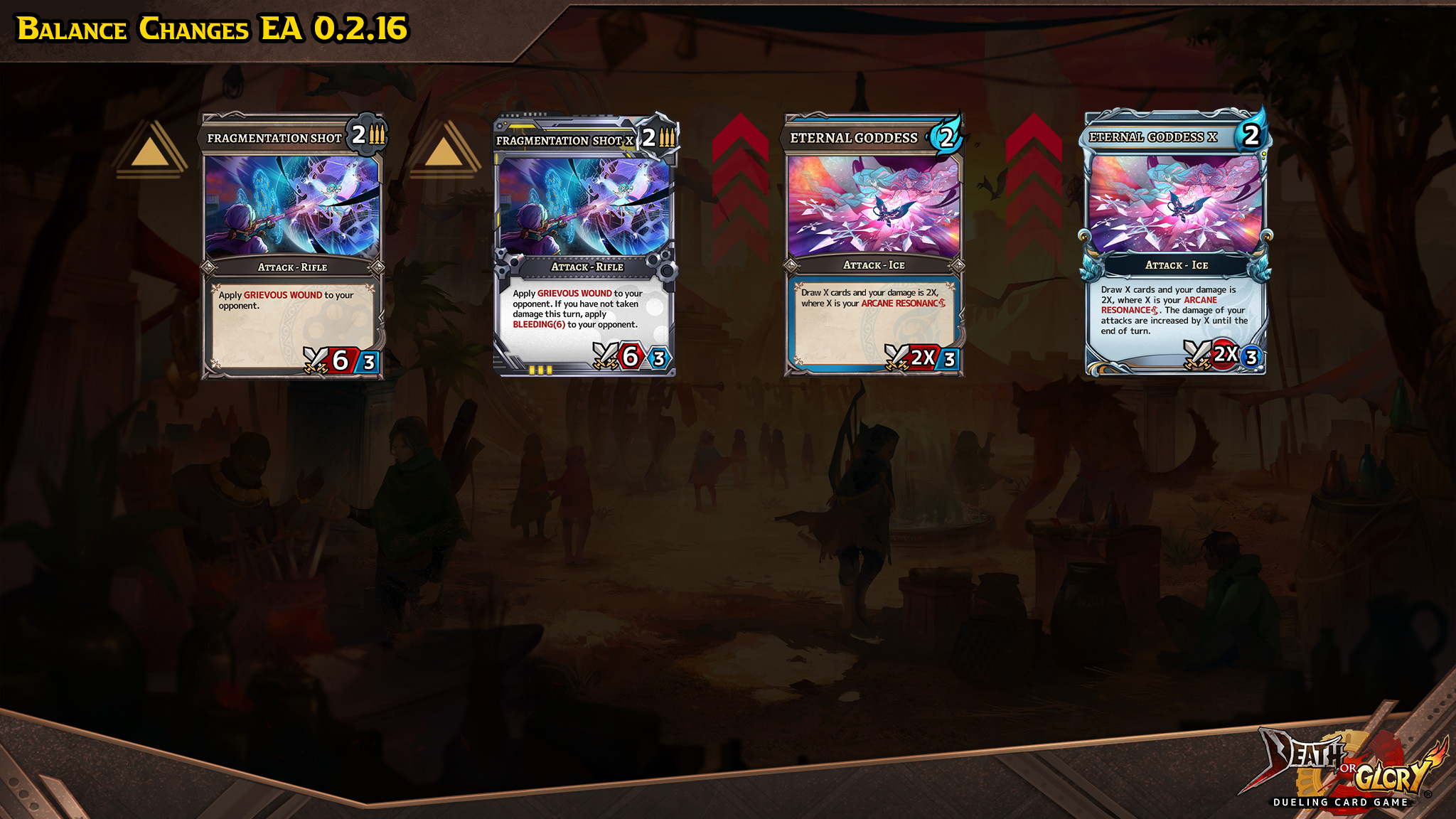 Crystal - Eternal Goddess and Eternal Goddess X Eternal Goddess was designed to be a build around and win condition for Crystal that was an alternate to her signature Freezing. But the low base damage of the card meant it was unreliable and easy to fail due to reactions, and the only way Crystal can set up the card to succeed was through Frozen, thus making the objective fall apart. We have decided to make the attack damage scalable through Arcane Resonance so with the right set up and build, this card can shine and break through without always relying on frozen.