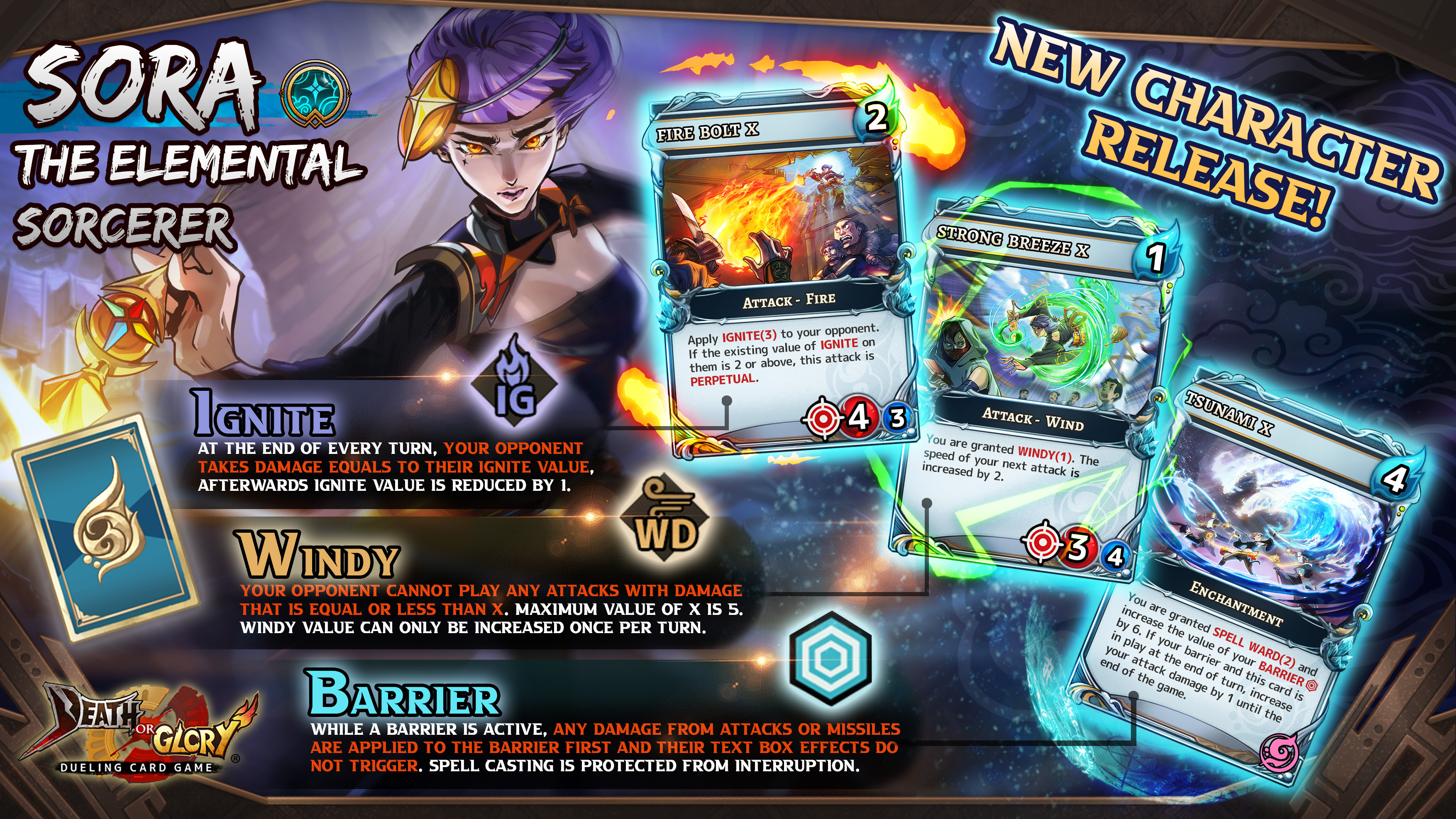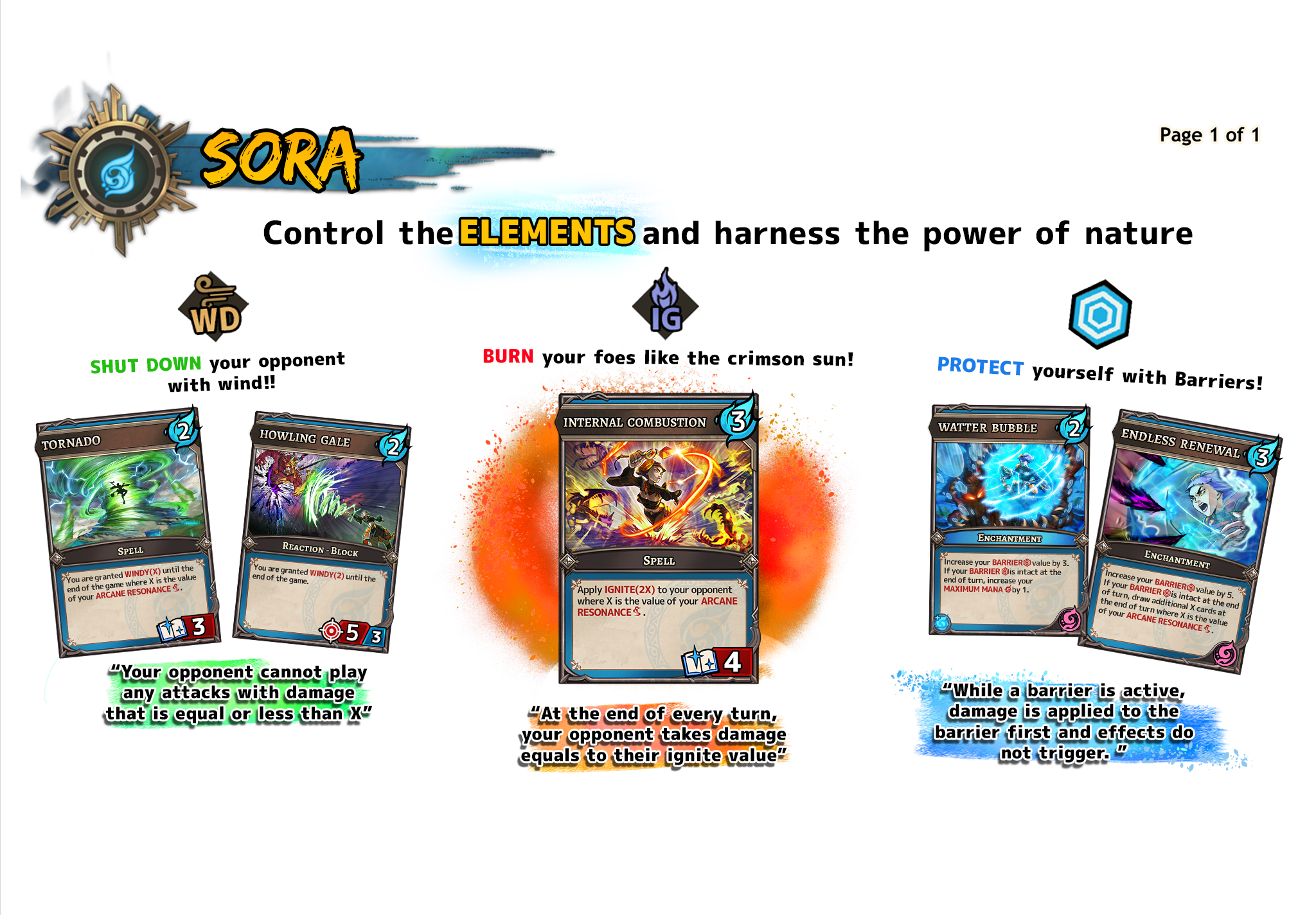 The last character to complete the second cycle of releases will be Sora, a spellslinger that is an expert in casting fire and water magic. Usually, one can only be a master of a single type of magic, but through her determination, Sora has mastered both the offensive flames and the protective waters. Use her ignite cards to create huge balls of fire that will cause tremendous amounts of end turn damage that cannot be blocked. Or become inevitable by replenishing and empowering yourself through a reservoir of barriers. Sora has multiple powerful builds that can focus on different mechanics, making every step of her battle, more difficult for the opponent to predict. A deck of potential combos awaits discovery and mastery.