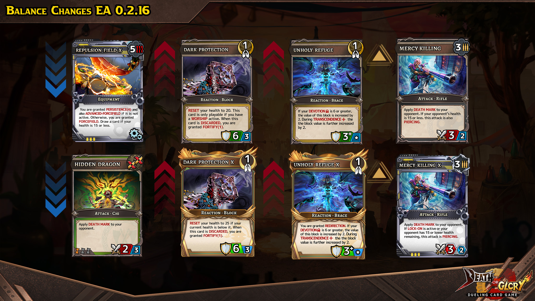 Lee - Hidden Dragon Death Mark cards are fun and we want to keep it as a viable build-around for players who like this element of both surprises and telegraphed moves. However, with such a powerful ability, cards that apply Death Mark cannot completely stand on their own to keep the balance. We have received feedback regarding techies feeling helpless against Death Mark as reloading becomes impossible since Hidden Dragon will be played whilst they are immobile. We have decided to reduce the base attack power of Hidden Dragon to a level where Barriers are also countering the card. Additionally, we feel that Death Mark cards should always require some form of setup and pre-requisite that is actively done by the player rather than being based on the opponent having a bad draw of their weaker reactions.